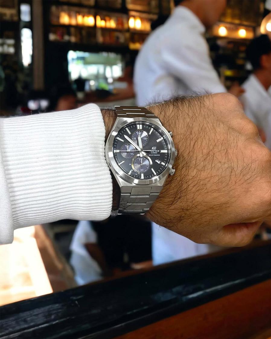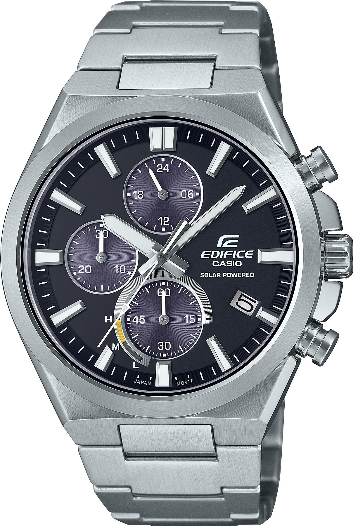 Мужские наручные часы Casio Edifice EQS-950D-1A. Точный кварцевый механизм с аналоговой индикацией. Корпус изготовлен из высококачественной нержавеющей стали 316L с высокими антикоррозийными свойствами. На стрелки и отметки нанесен светонакопительный состав, благодаря этому считывать информацию с циферблата возможно и в темноте. На циферблате отображается текущее число месяца. Солнечная батарейка. Солнечная подзаряжающаяся батарейка обеспечивает питание часов для работы. Функция хронографа. Индикатор запаса хода. Браслет из нержавеющей стали. Прочное, устойчивое к царапинам минеральное стекло защищает часы от повреждений. Часы являются водонепроницаемыми до 10 Бар. Цвет корпуса: Серебристый. Цвет циферблата: Черный. Ширина (с заводной головкой): 48мм. Толщина: 12мм. Гарантия: 2 года. Другие наименования модели: EQS-950D-1AVUDF.