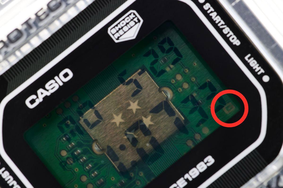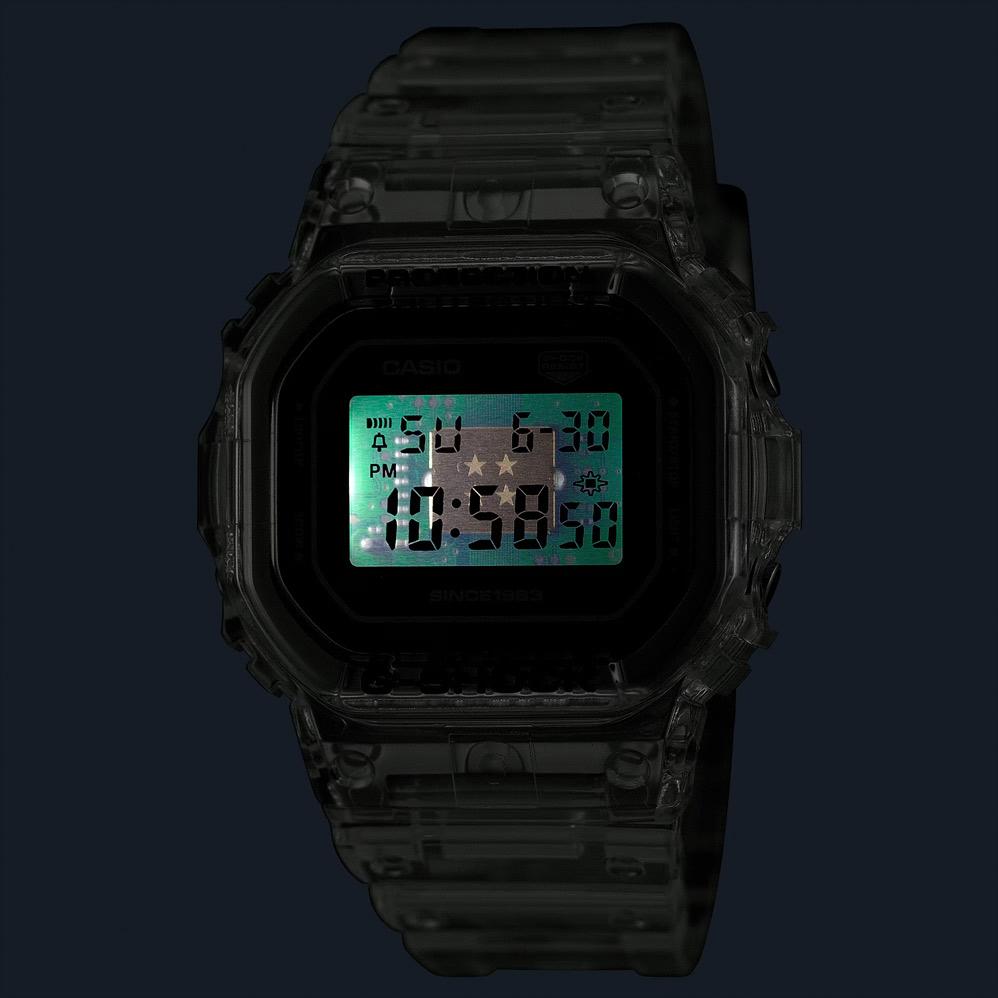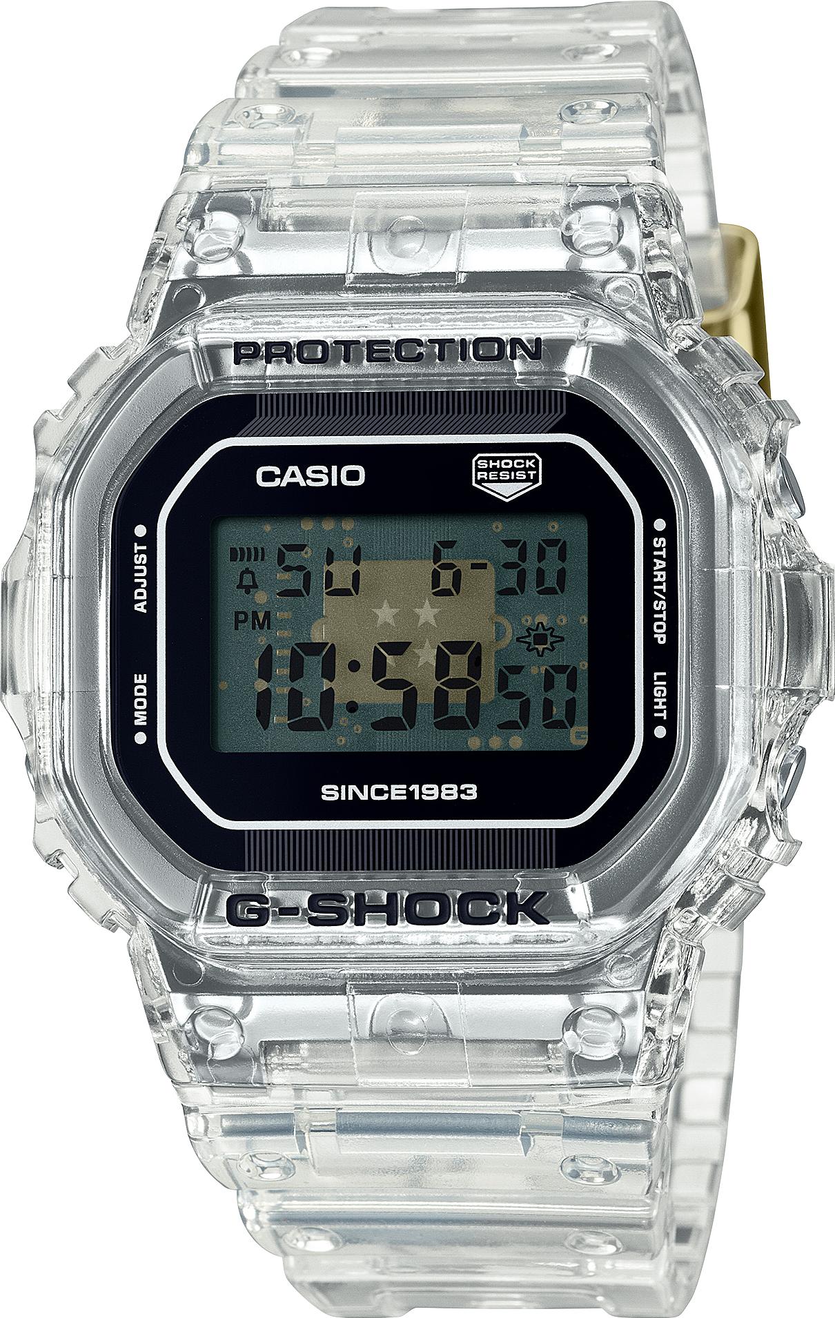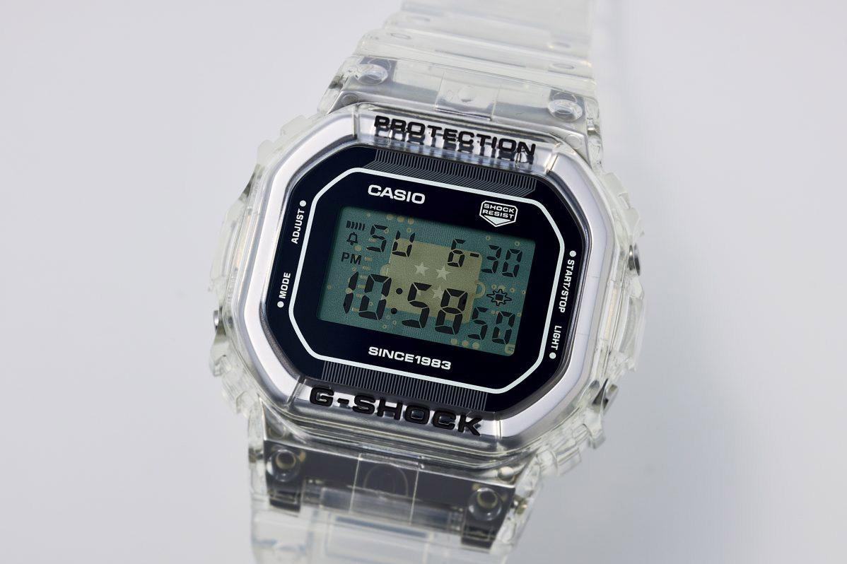 Лимитированная модель G-SHOCK из серии Clear Remix в корпусе DW-5600, выпущенная в честь 40-летия бренда G-SHOCK. Модель выполнена в полупрозрачном полимерном корпусе и имеет прозрачный циферблат, под которым можно увидеть плату и сам модуль часов, на котором нанесены 4 звезды — в честь четырех десятилетий бренда. В самом нижнем правом углу циферблата на плате можно увидеть и лого джишок в виде буквы "G", а в нижней части циферблата находится надпись "Since 1983". Кварцевый механизм с высокой точностью. Издавая звуковой сигнал в установленное время, будильник напоминает о событиях, которые повторяются каждый день. Корпус часов изготовлен из нержавеющей стали. Класс водозащиты: 200 метров, позволит плавать, нырять и заниматься другими водными видами спорта. Каучуковый прозрачный ремешок на стандартной застежке.