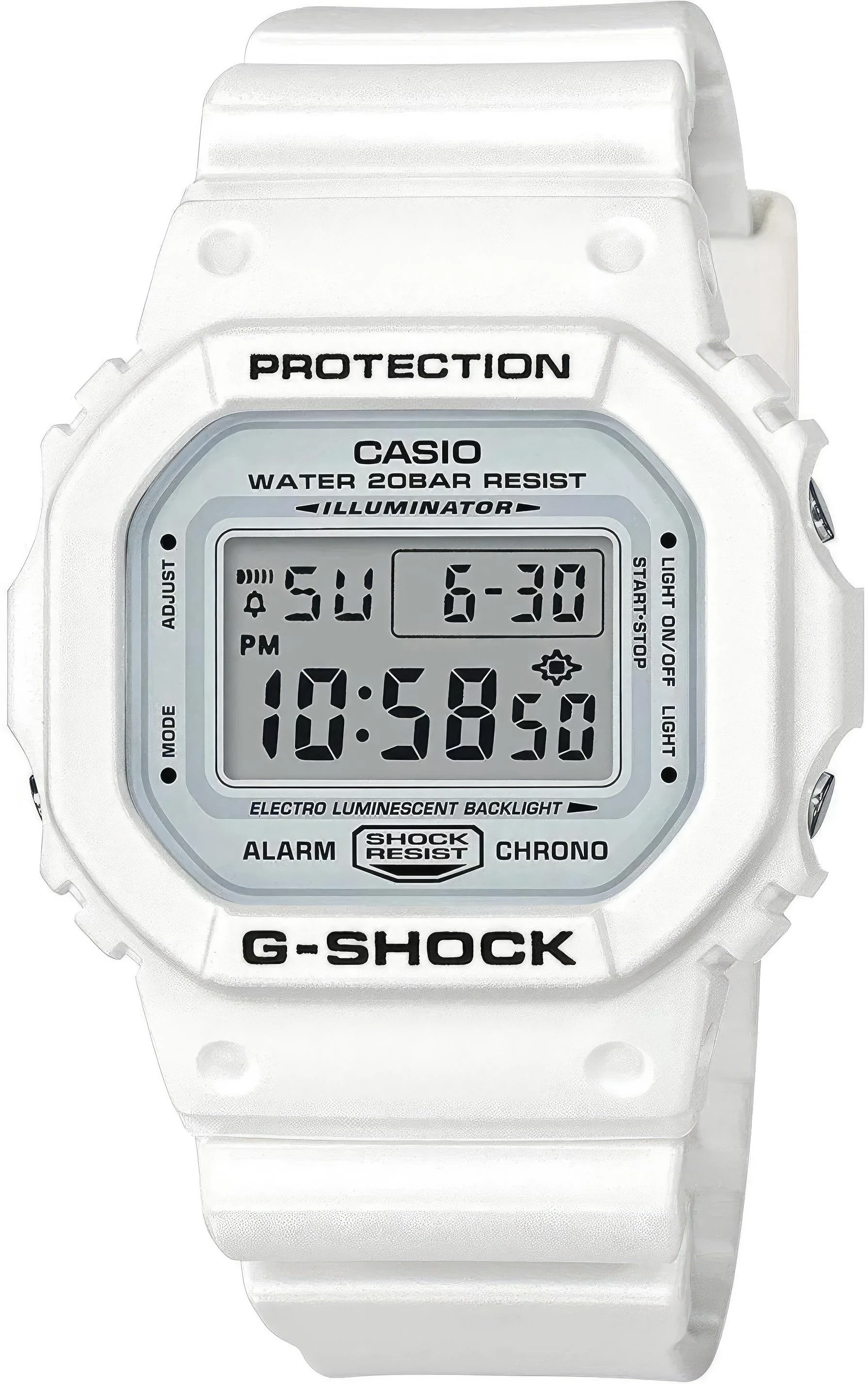 Ударопрочные часы совмещают все преимущества и дизайн первых G-Shock с новой полностью белой окраской корпуса и ремешка. Минеральное стекло. Водозащита 20АТМ. Многофункциональный механизм с цифровой индикацией на жидкокристаллическом дисплее.