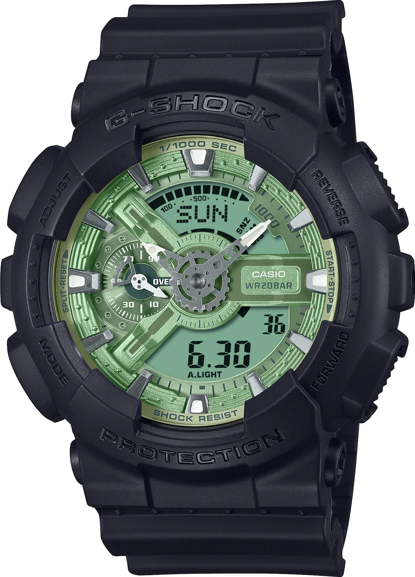 Мужские наручные часы Casio G-Shock GA-110CD-1A3. Точный кварцевый механизм с аналого-цифровой индикацией. В отличие от механических часов, не требуют завода и работают от батареи, показывая отклонение всего несколько секунд в месяц. Светодиодная подсветка обеспечивает равномерное и энергоэффективное освещение циферблата. Для активации обычно требуется нажатие отдельной кнопки, что позволяет экономить заряд батареи.Полимерный ремешок. Натуральный полимерный материал является идеальным для изготовления ремешка благодаря своей чрезвычайной прочности и гибкости. После настройки автоматический календарь всегда отображает точную дату. Для подсветки дисплея используется светодиод, а так же имеет функцию автоматического включения подсветки, если Вы наклоните часы к своему лицу. Функция будильника. Ежечасный сигнал. Отображение текущего времени в основных городах и конкретных областях по всему миру. Функция таймера. Таймеры обратного отсчета напомнят Вам о текущих или особенных событиях, издав звуковой сигнал в установленное время. Ударопрочная конструкция часов защищает от ударов и вибрации. Отображение времени возможно в 12-часовом или 24-часовом формате. Полимерный корпус надежно защищает часы от механических повреждений. Прочное, устойчивое к царапинам минеральное стекло защищает часы от повреждений. Часы являются водонепроницаемыми до 20 Бар. Цвет корпуса: Черный. Цвет циферблата: Зеленый. Высота (с ушками): 55 мм. Толщина: 16.9 мм. Гарантия: 2 года. Другие наименования модели: GA-110CD-1A3DR, GA-110CD-1A3ER.