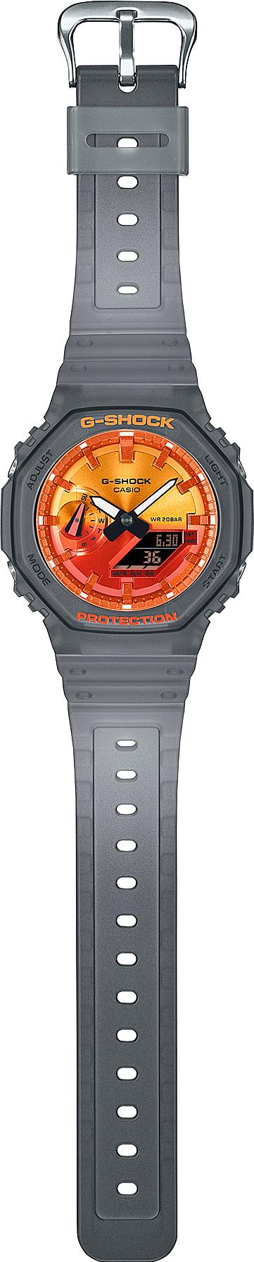 G-SHOCK представляет огненную коллекцию Flame Inside, где смелый дизайн встречается с безудержной энергией цвета. Эти часы — визуальное воплощение горячей страсти к преодолению границ, с циферблатами, пылающими яркими градиентами синих и оранжевых оттенков. Культовая модель GA-2100 с узнаваемым восьмиугольным корпусом получила дерзкое обновление: циферблат с эффектом живого пламени словно охвачен настоящими огненными языками, а ремешок с принтом "дымчатых" разводов создает иллюзию костра на запястье. Каждая деталь этих часов будто раскалена до предела — от пламенеющего градиента до металлизированных акцентов, напоминающих раскаленный металл. Но под этим горячим экстерьером скрывается все та же неубиваемая начинка G-SHOCK: ударопрочность, водонепроницаемость и точность хода. Это больше чем часы — это носимый арт-объект для тех, кто привык зажигать и не признает полутонов. Flame Inside не просто выделяет вас из толпы, они заявляют о вашей внутренней огненной страсти без единого слова. Коллекция выпущена ограниченным тиражом, как и положено настоящему пламени — его нельзя удержать в руках надолго.