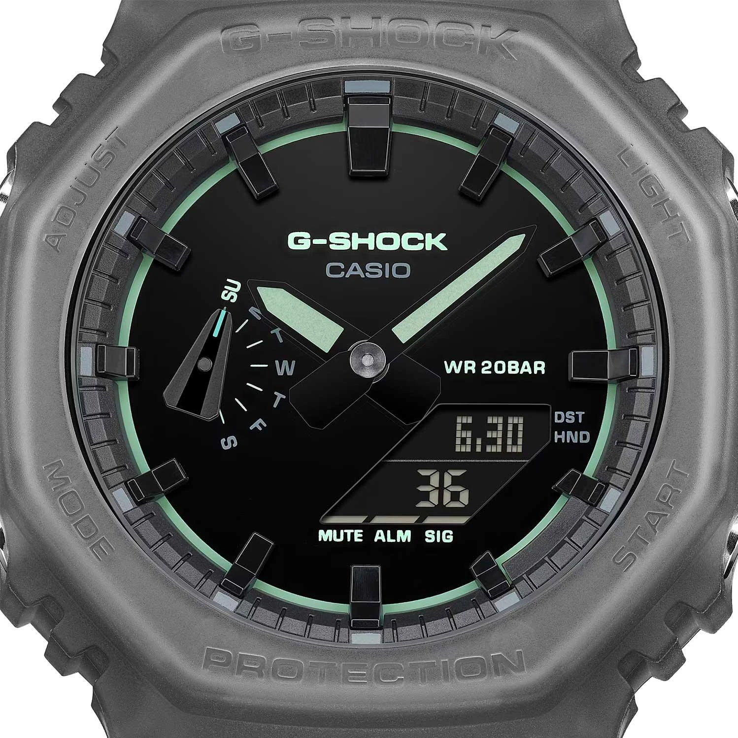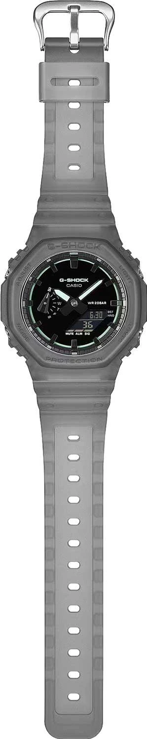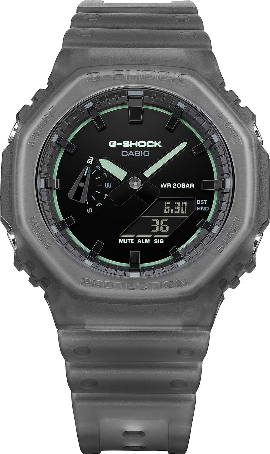 Мужские часы G-Shock GA-2100K-1A. Полупрозрачный корпус и ремешок вдохновлены клубными тусовками и ночной жизнью мегаполиса. Структура Carbon Core Guard. Противоударный пластиковый корпус с карбоновыми волокнами более прочный и, в то же время, более легкий. Этот же материал защищает внутренний модуль от повреждений и деформаций при ударах. Двойная подcветка: циферблат и ЖК-дисплеи подсвечиваются светодиодом, благодаря наличию функции задержки, после отпускания кнопки освещение горит еще несколько секунд. Настраиваемое послесвечение 1,5 или 3сек. Цвет подсветки: белый. Необритовое светонакопительное покрытие обеспечивает длительное послесвечение в темноте даже после кратковременного нахождения на свету. 12-ти и 24-х часовой формат времени. Секундомер с двумя точностями показаний: 1/100с (до 1ч) и 1с (после 1ч) и временем измерения 24ч. Режимы измерения: прошедшее время, промежуточное время, время 1-го и 2-го места. Таймер обратного отсчета от 1с до 24ч. Автоматические календарь до 2099 года. 5 будильников, ежечасный сигнал. Мировое время – 48 городов (31 часовой пояс), всемирное координированное время (UTC). Функция включения/отключения летнего времени. Ретроградный указатель для недели. Функции отключения/включения звука и перемещения стрелок для беспрепятственного просмотра информации на цифровых дисплеях. Стальная задняя крышка крепится на 4-х винтах. Батарейка рассчитана на 3 года. Ремешок из полимерного материала с классической застежкой и системой быстрой замены.