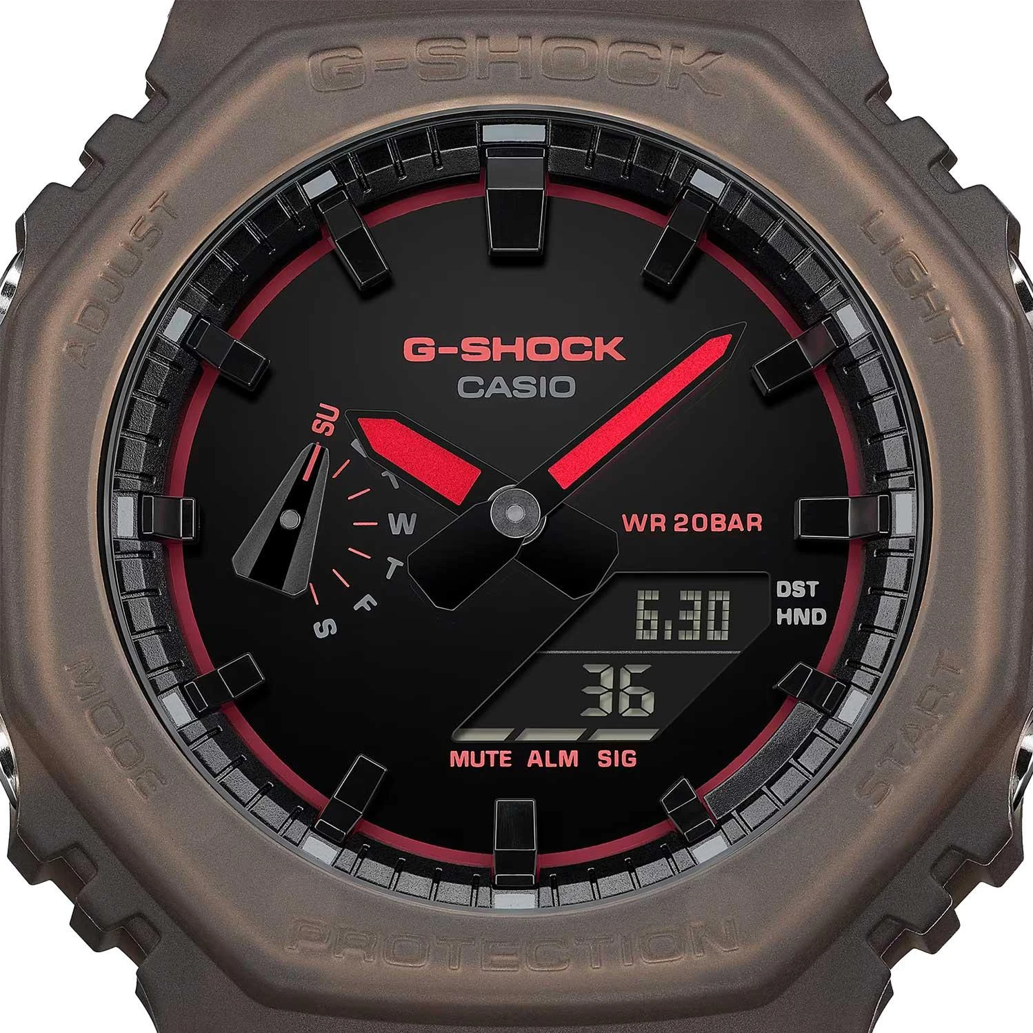 Мужские часы G-Shock GA-2100K-5A. Полупрозрачный корпус и ремешок вдохновлены клубными тусовками и ночной жизнью мегаполиса. Структура Carbon Core Guard. Противоударный пластиковый корпус с карбоновыми волокнами более прочный и, в то же время, более легкий. Этот же материал защищает внутренний модуль от повреждений и деформаций при ударах. Двойная подcветка: циферблат и ЖК-дисплеи подсвечиваются светодиодом, благодаря наличию функции задержки, после отпускания кнопки освещение горит еще несколько секунд. Настраиваемое послесвечение 1,5 или 3сек. Цвет подсветки: белый. Необритовое светонакопительное покрытие обеспечивает длительное послесвечение в темноте даже после кратковременного нахождения на свету. 12-ти и 24-х часовой формат времени. Секундомер с двумя точностями показаний: 1/100с (до 1ч) и 1с (после 1ч) и временем измерения 24ч. Режимы измерения: прошедшее время, промежуточное время, время 1-го и 2-го места. Таймер обратного отсчета от 1с до 24ч. Автоматические календарь до 2099 года. 5 будильников, ежечасный сигнал. Мировое время – 48 городов (31 часовой пояс), всемирное координированное время (UTC). Функция включения/отключения летнего времени. Ретроградный указатель для недели. Функции отключения/включения звука и перемещения стрелок для беспрепятственного просмотра информации на цифровых дисплеях. Стальная задняя крышка крепится на 4-х винтах. Батарейка рассчитана на 3 года. Ремешок из полимерного материала с классической застежкой и системой быстрой замены.