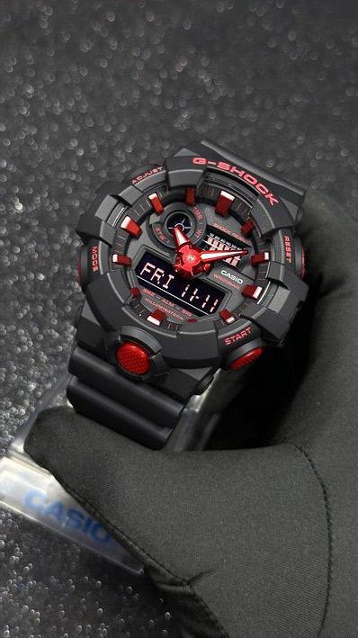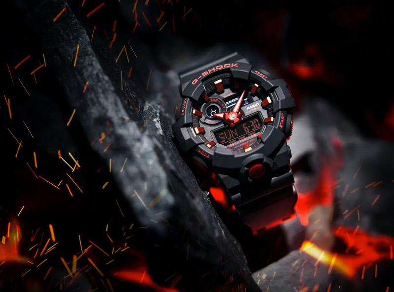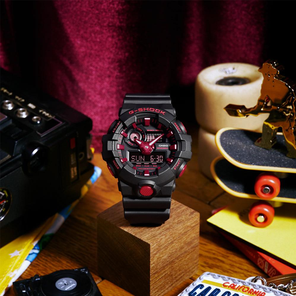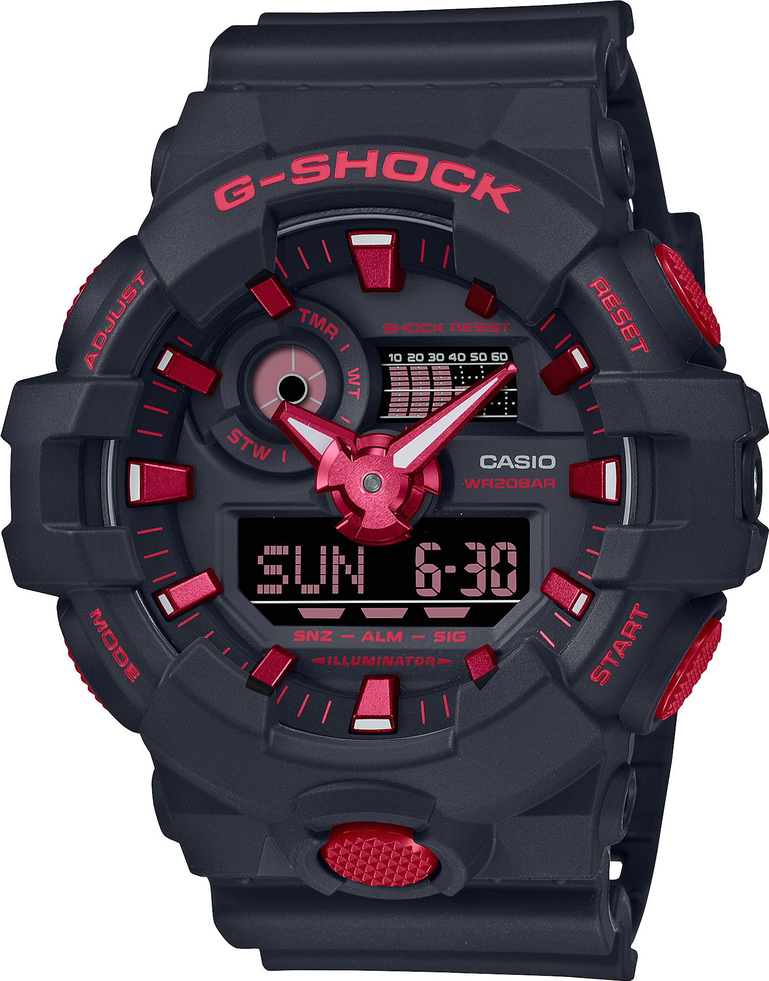 Мужские наручные часы Casio G-Shock GA-700BNR-1A. Точный кварцевый механизм с аналого-цифровой индикацией. Полимерный корпус надежно защищает часы от механических повреждений. На стрелки и отметки нанесен светонакопительный состав, благодаря этому считывать информацию с циферблата возможно и в темноте. На циферблате отображается текущее число, месяц и день недели. Ударопрочная конструкция часов защищает от ударов и вибрации. Функция хронографа. Функция таймера. Таймеры обратного отсчета напомнят Вам о текущих или особенных событиях, издав звуковой сигнал в установленное время. Функция будильника. Аккумулятор обеспечивает часы достаточным питанием приблизительно на 5 лет. Отображение текущего времени в основных городах и конкретных областях по всему миру. После настройки автоматический календарь всегда отображает точную дату. Отображение времени возможно в 12-часовом или 24-часовом формате. Полимерный ремешок. Натуральный полимерный материал является идеальным для изготовления ремешка благодаря своей чрезвычайной прочности и гибкости. Прочное, устойчивое к царапинам минеральное стекло защищает часы от повреждений.Часы являются водонепроницаемыми до 20 Бар. Цвет корпуса: Черный. Цвет циферблата: Красный. Ширина (с заводной головкой): 57мм. Толщина: 18мм. Гарантия: 2 года. Другие наименования модели: GA-700BNR-1ADR.