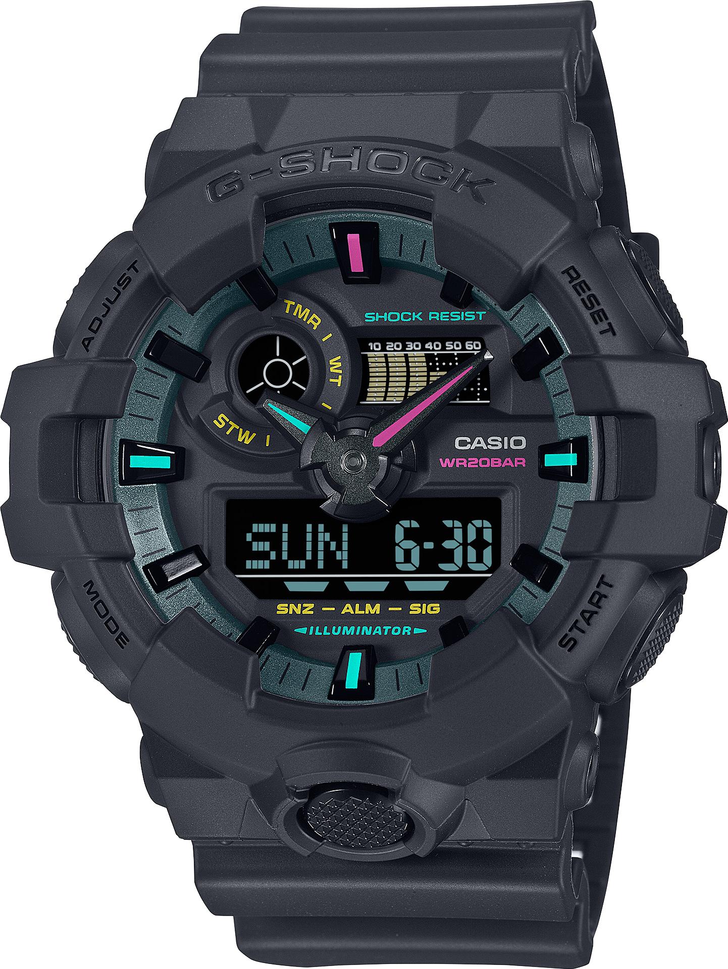 Мужские наручные часы Casio G-Shock GA-700MF-1A. Точный кварцевый механизм с аналого-цифровой индикацией. Полимерный ремешок. Натуральный полимерный материал является идеальным для изготовления ремешка благодаря своей чрезвычайной прочности и гибкости. После настройки автоматический календарь всегда отображает точную дату. Для подсветки дисплея используется светодиод, а так же имеет функцию автоматического включения подсветки, если Вы наклоните часы к своему лицу. Функция будильника. Ежечасный сигнал. Отображение текущего времени в основных городах и конкретных областях по всему миру. Функция перемещения стрелок. Нажатие на кнопку обеспечит перемещение стрелок в такое положение, которое позволит Вам легко считать информацию с маленьких цифровых дисплеев – например, дату или показатели секундомера. Функция таймера. Таймеры обратного отсчета напомнят Вам о текущих или особенных событиях, издав звуковой сигнал в установленное время. Ударопрочная конструкция часов защищает от ударов и вибрации. Отображение времени возможно в 12-часовом или 24-часовом формате. Полимерный ремешок. Натуральный полимерный материал является идеальным для изготовления ремешка благодаря своей чрезвычайной прочности и гибкости. Прочное, устойчивое к царапинам минеральное стекло защищает часы от повреждений. На циферблате отображается текущее число, месяц и день недели. Часы являются водонепроницаемыми до 20 Бар. Цвет циферблата: Черный. Цвет корпуса: Черный. Светодиодная подсветка. Толщина: 18 мм. Гарантия: 2 года.