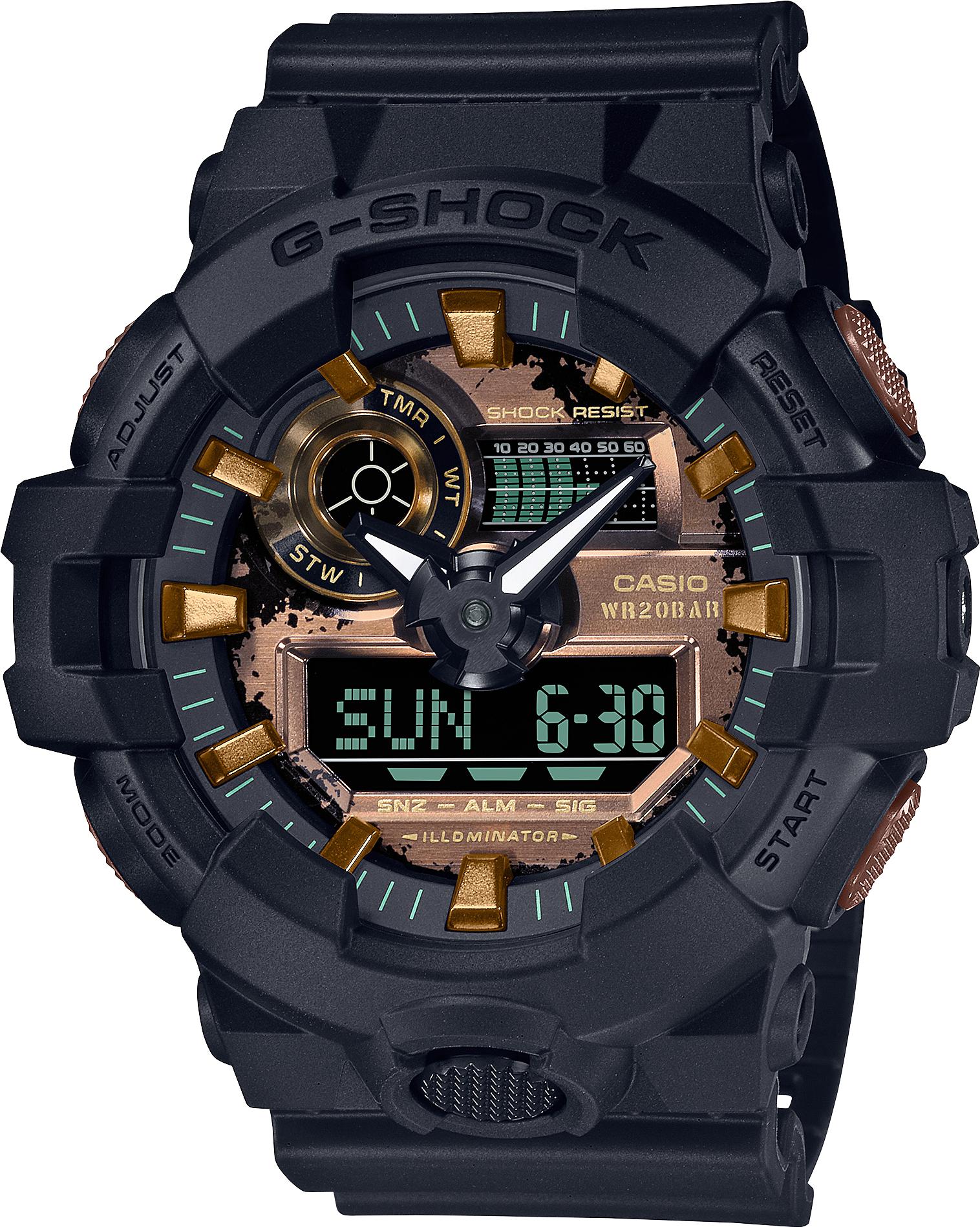 Мужские наручные часы Casio G-Shock GA-700RC-1A. Точный кварцевый механизм с аналого-цифровой индикацией. Полимерный ремешок. Натуральный полимерный материал является идеальным для изготовления ремешка благодаря своей чрезвычайной прочности и гибкости. После настройки автоматический календарь всегда отображает точную дату. Аккумулятор обеспечивает часы достаточным питанием приблизительно на 5 лет. Функция будильника. Функция хронографа. Отображение текущего времени в основных городах и конкретных областях по всему миру. Функция таймера. Таймеры обратного отсчета напомнят Вам о текущих или особенных событиях, издав звуковой сигнал в установленное время. Ударопрочная конструкция часов защищает от ударов и вибрации. Отображение времени возможно в 12-часовом или 24-часовом формате. Полимерный ремешок. Натуральный полимерный материал является идеальным для изготовления ремешка благодаря своей чрезвычайной прочности и гибкости. Прочное, устойчивое к царапинам минеральное стекло защищает часы от повреждений. На циферблате отображается текущее число, месяц и день недели. Часы являются водонепроницаемыми до 20 Бар. Цвет циферблата: Черный. Цвет корпуса: Золотистый. Светодиодная подсветка. На стрелки и отметки нанесен светонакопительный состав, благодаря этому считывать информацию с циферблата возможно и в темноте. Толщина: 18 мм. Гарантия: 2 года.