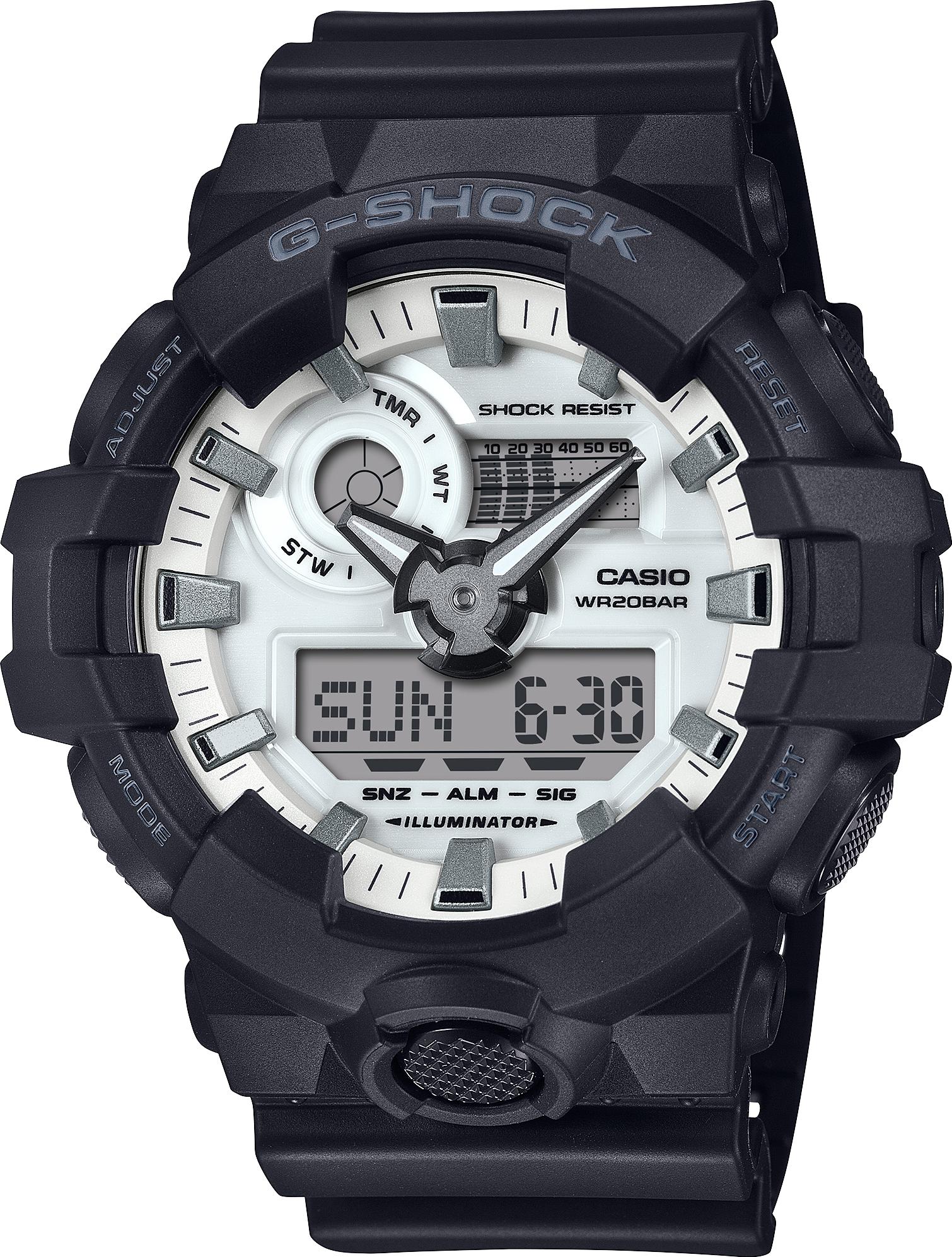 Мужские наручные часы Casio G-Shock GA-700WD-1A. Точный кварцевый механизм с аналого-цифровой индикацией. Полимерный ремешок. Натуральный полимерный материал является идеальным для изготовления ремешка благодаря своей чрезвычайной прочности и гибкости. После настройки автоматический календарь всегда отображает точную дату. Аккумулятор обеспечивает часы достаточным питанием приблизительно на 5 лет. Функция будильника. Ежечасный сигнал. Функция хронографа. Отображение текущего времени в основных городах и конкретных областях по всему миру. Функция таймера. Таймеры обратного отсчета напомнят Вам о текущих или особенных событиях, издав звуковой сигнал в установленное время. Ударопрочная конструкция часов защищает от ударов и вибрации. Отображение времени возможно в 12-часовом или 24-часовом формате. Полимерный ремешок. Натуральный полимерный материал является идеальным для изготовления ремешка благодаря своей чрезвычайной прочности и гибкости. Прочное, устойчивое к царапинам минеральное стекло защищает часы от повреждений. На циферблате отображается текущее число, месяц и день недели. Часы являются водонепроницаемыми до 18 Бар. Цвет циферблата: Черный. Цвет корпуса: Белый. Светодиодная подсветка. Высота (с ушками): 58 мм. Толщина: 19 мм. Гарантия: 2 года.