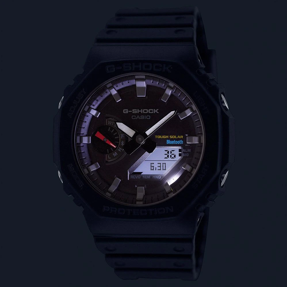 Мужские наручные часы Casio G-Shock GA-B2100-1A. Точный кварцевый механизм с аналого-цифровой индикацией. Полимерный ремешок. Натуральный полимерный материал является идеальным для изготовления ремешка благодаря своей чрезвычайной прочности и гибкости. После настройки автоматический календарь всегда отображает точную дату. Автоматическая корректировака времени. Для подсветки дисплея используется светодиод, а так же имеет функцию автоматического включения подсветки, если Вы наклоните часы к своему лицу. Функция Bluetooth позволяет удобно отображать все метрики с часов на экране смартфона, а также выводить на часы уведомления о входящих звонках, сообщениях и имейлах. Функция будильника. Ежечасный сигнал. Отображение текущего времени в основных городах и конкретных областях по всему миру. Функция перемещения стрелок. Нажатие на кнопку обеспечит перемещение стрелок в такое положение, которое позволит Вам легко считать информацию с маленьких цифровых дисплеев – например, дату или показатели секундомера. Солнечная батарейка. Солнечная подзаряжающаяся батарейка обеспечивает питание часов для работы. Функция таймера. Таймеры обратного отсчета напомнят Вам о текущих или особенных событиях, издав звуковой сигнал в установленное время. Ударопрочная конструкция часов защищает от ударов и вибрации. Отображение времени возможно в 12-часовом или 24-часовом формате. Карбоновый браслет. Прочное, устойчивое к царапинам минеральное стекло защищает часы от повреждений. На циферблате отображается текущее число, месяц и день недели. Часы являются водонепроницаемыми до 20 Бар. Цвет циферблата: Черный. Цвет корпуса: Черный. Светодиодная подсветка. Толщина: 12 мм. Гарантия: 2 года.
