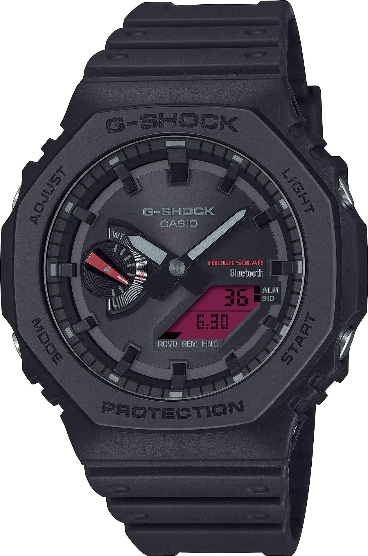 Яркий красный дисплей эффектно контрастирует с глубоким черным безелем, ремешком и циферблатом, обеспечивая превосходную читаемость и подчеркивая агрессивный, брутальный характер этих часов. Функция подсветки усиливает видимость цифрового дисплея в любых условиях.