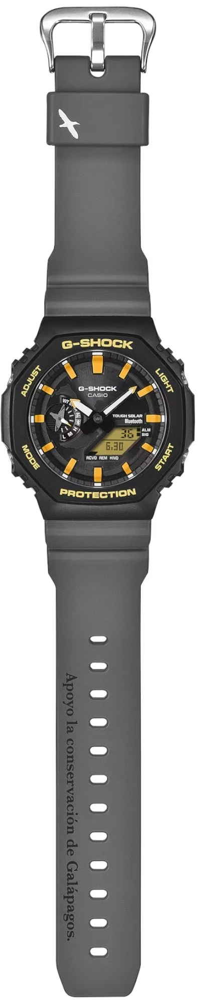 Редкая лимитированная модель 2025 года — коллаборация G-Shock и Фонда имени Чарльза Дарвина в черном матовом корпусе GA-B2100 на сером полупрозрачном полимерном ремешке. Коллаборация посвящена фауне Галапагосских островов, ведь именно прибывая там в 1835 году Чарльзу Дарвину пришла идея о его теории эволюции. Каждая из вышедших лимитированных моделей посвящена одному из редких обитателей животного мира архипелага. Для данной модели был выбран галапагосский альбатрос, одна из крупнейших птиц на островах, с размахом крыльев более двух метров. Именно силуэт альбатроса, скользящего по восходящим потокам воздуха, получил индикатор режима часов у девяти часов по циферблату, а также держатель ремешка. На циферблате можно заметить карту Галапагосских островов, а яркие окончания стрелок похожи на клюв морской птицы. На ремешке вы найдете слоган на испанском: “Apoyo la conservación de Galápagos”. В переводе это означает: “Я поддерживаю сохранение Галапагосских островов”. Модель сохранила внешний облик своих предшественников по серии GA-2100, но получила более технологичный модуль с синхронизацией со смартфоном через Bluetooth и солнечной батареей. В остальном модель по-прежнему отличается от других G-Shock своей легкостью, компактностью и толщиной корпуса всего 11.9 мм, что стало возможным благодаря технологии Carbon Core Guard: модуль часов защищает легкий и сверхпрочный полиуретановый корпус с углеродным армированием, а циферблат покрыт закаленным минеральным стеклом.