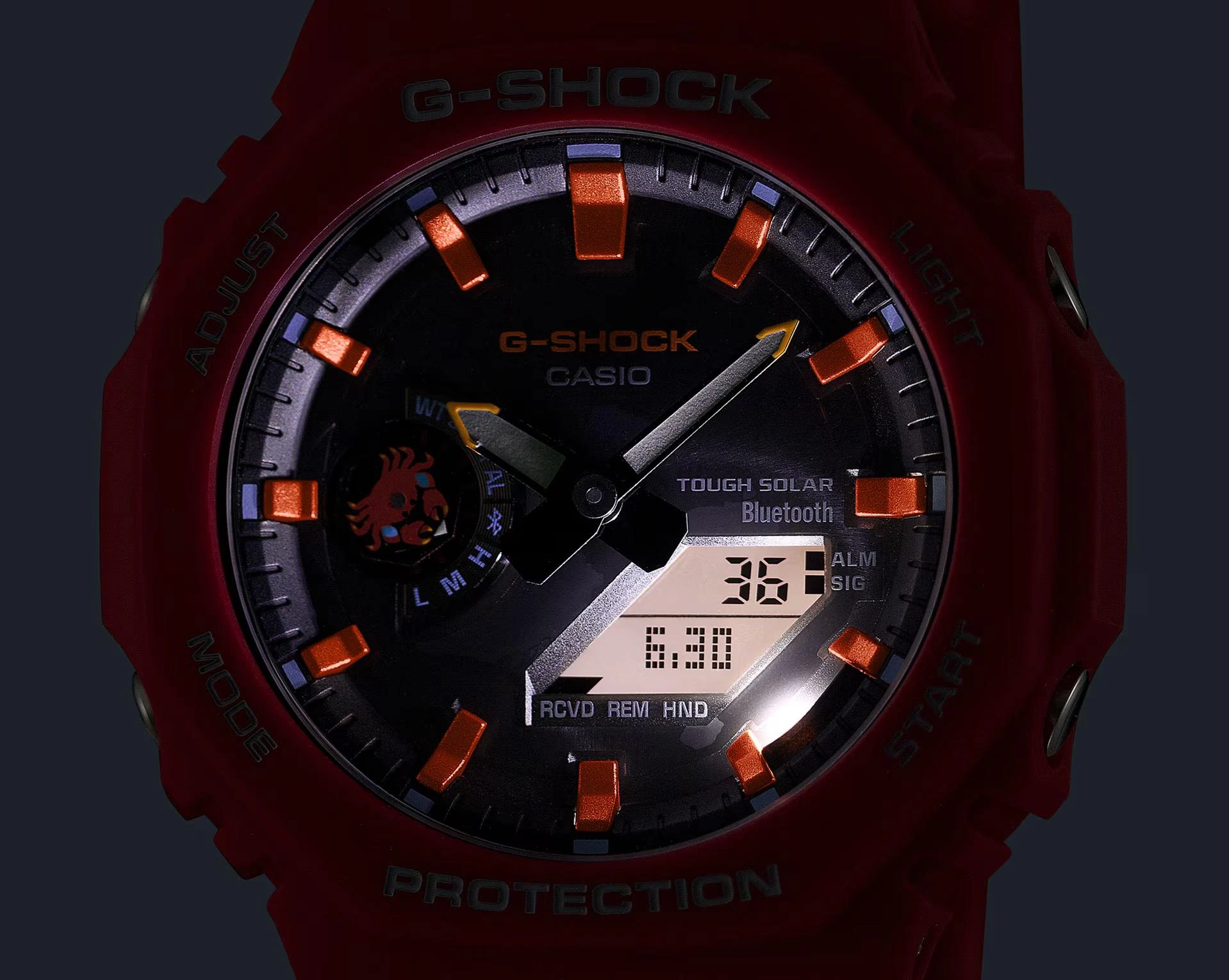 Редкая лимитированная модель 2025 года — коллаборация G-Shock и Фонда имени Чарльза Дарвина в красном матовом корпусе GA-B2100 на сером полупрозрачном полимерном ремешке. Коллаборация посвящена фауне Галапагосских островов, ведь именно прибывая там в 1835 году Чарльзу Дарвину пришла идея о его теории эволюции. Каждая из вышедших лимитированных моделей посвящена одному из редких обитателей животного мира архипелага. Для данной модели был выбран краб Sally Lightfoot, который обитает на скалистых берегах и песчаных пляжах Галапагосов. Именно в виде силуэта данного краба реализован индикатор режима часов у девяти часов по циферблату, а также на держателе ремешка. На циферблате можно заметить карту Галапагосских островов, а яркие окончания стрелок похожи на клешни краба. На ремешке вы найдете слоган на испанском: “Apoyo la conservación de Galápagos”. В переводе это означает: “Я поддерживаю сохранение Галапагосских островов”. Модель сохранила внешний облик своих предшественников по серии GA-2100, но получила более технологичный модуль с синхронизацией со смартфоном через Bluetooth и солнечной батареей. В остальном модель по-прежнему отличается от других G-Shock своей легкостью, компактностью и толщиной корпуса всего 11.9 мм, что стало возможным благодаря технологии Carbon Core Guard: модуль часов защищает легкий и сверхпрочный полиуретановый корпус с углеродным армированием, а циферблат покрыт закаленным минеральным стеклом.