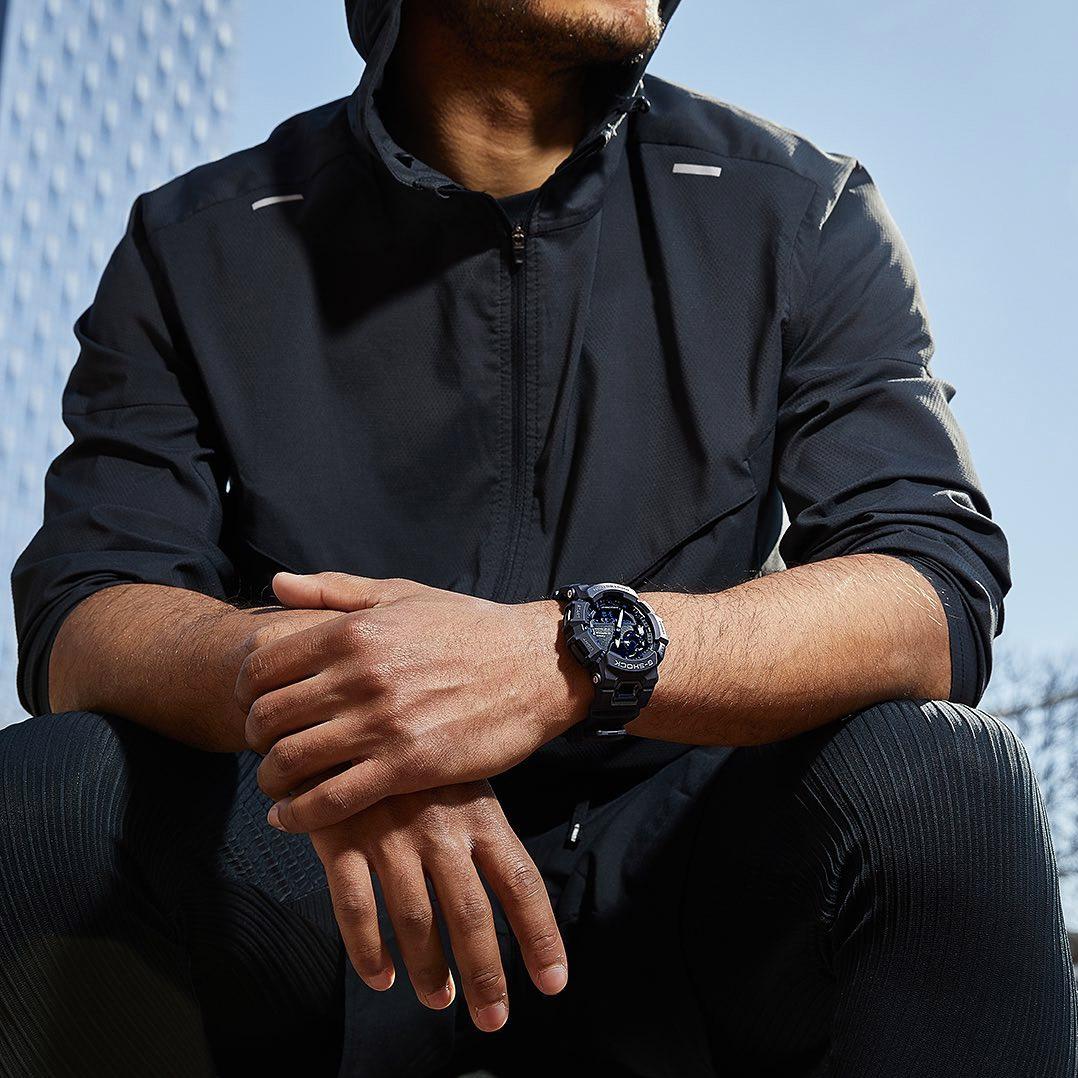 Мужские противоударные аналого-цифровые кварцевые часы из серии G-Shock с модулем Bluetooth Smart. Круглый пластиковый корпус. Циферблат с жидко-кристаллическим дисплеем. Минеральное стекло. Водозащита 200 м. Пластиковый ремешок. Простая пряжка.