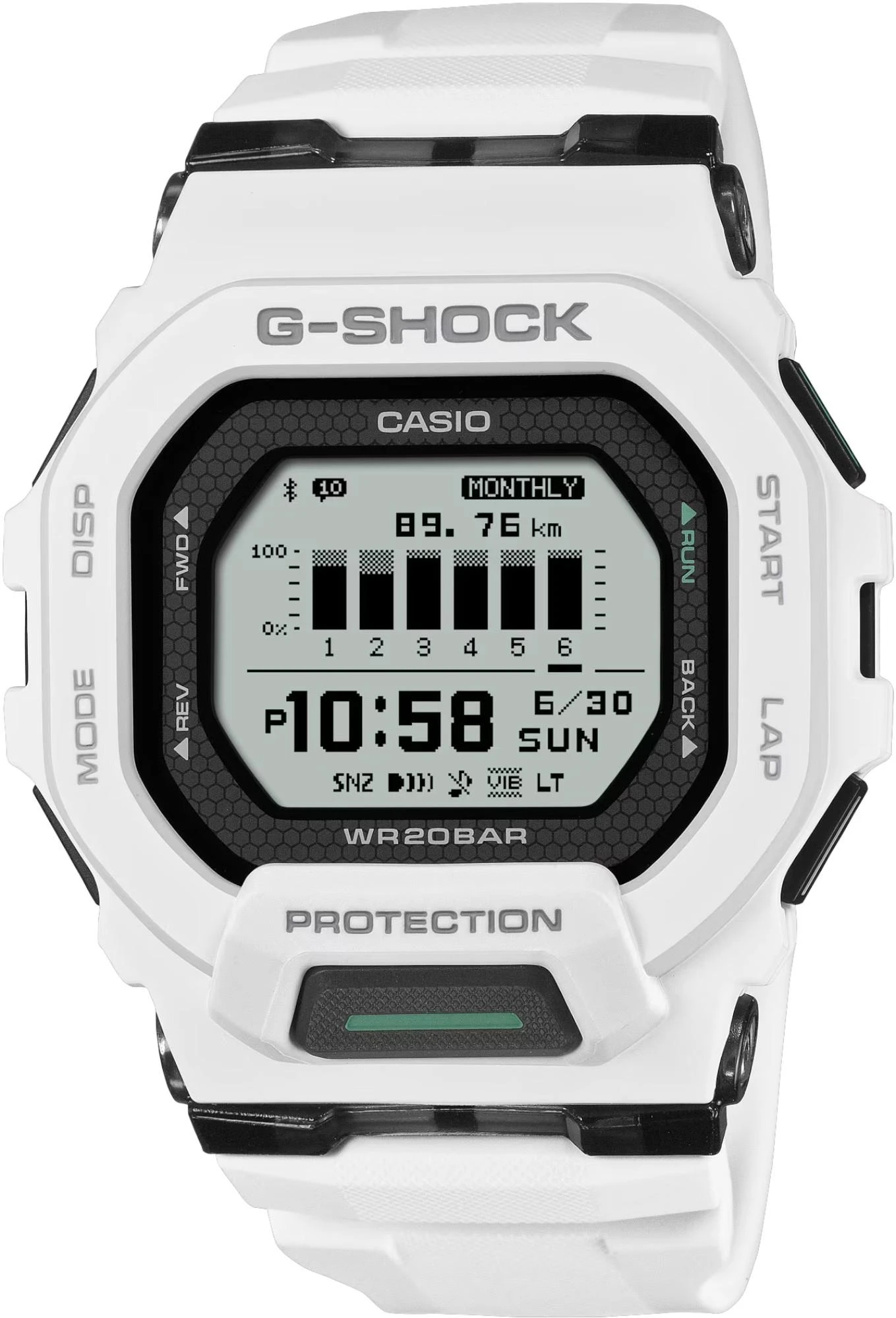 Мужские ударопрочные часы из спортивной коллекции G-SQUAD. Модель оснащена технологией Bluetooth для синхронизации со смартфоном: время устанавливается автоматически, а через приложение G-SHOCK MOVE можно настраивать тренировки и анализировать активность. Часы получили высококонтрастный дисплей MIP и яркую светодиодную подсветку Super Illuminator с настраиваемым послесвечением. На экран выводятся уведомления о входящих вызовах и сообщениях. Предусмотрены функции поиска телефона, вибро-уведомления и авиарежим. Встроенный акселерометр отслеживает количество шагов, пройденную дистанцию и расход калорий. Секундомер с точностью 1 секунда и пределом измерения до 100 часов поддерживает память до 100 тренировок (до 140 записей кругов в каждой). Предусмотрено 5 независимых интервальных таймеров с автоповтором до 20 раз — идеальное решение для функциональных тренировок. Функционал также включает 4 ежедневных будильника с функцией повтора, автоматический календарь, 12/24-часовой формат времени и мировое время в 38 городах. Звук кнопок можно отключить. Корпус и ремешок выполнены из прочного полимерного материала. Минеральное стекло устойчиво к царапинам, а конструкция G-SHOCK защищает от ударов и вибрации. Габариты корпуса: 48,4 х 45,9 х 15 мм. Водозащита 20 Бар (WR 200) подходит для плавания и погружений.