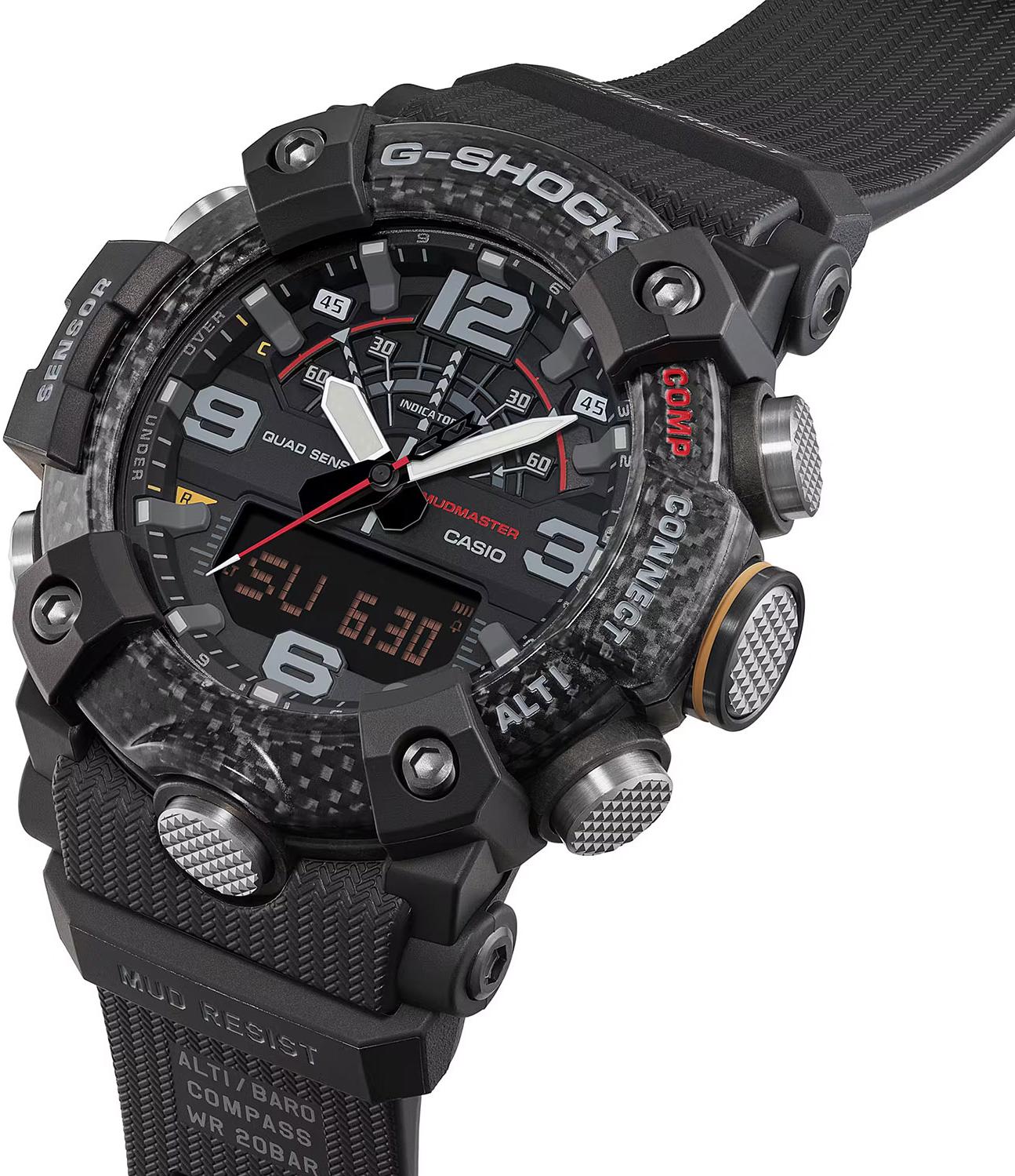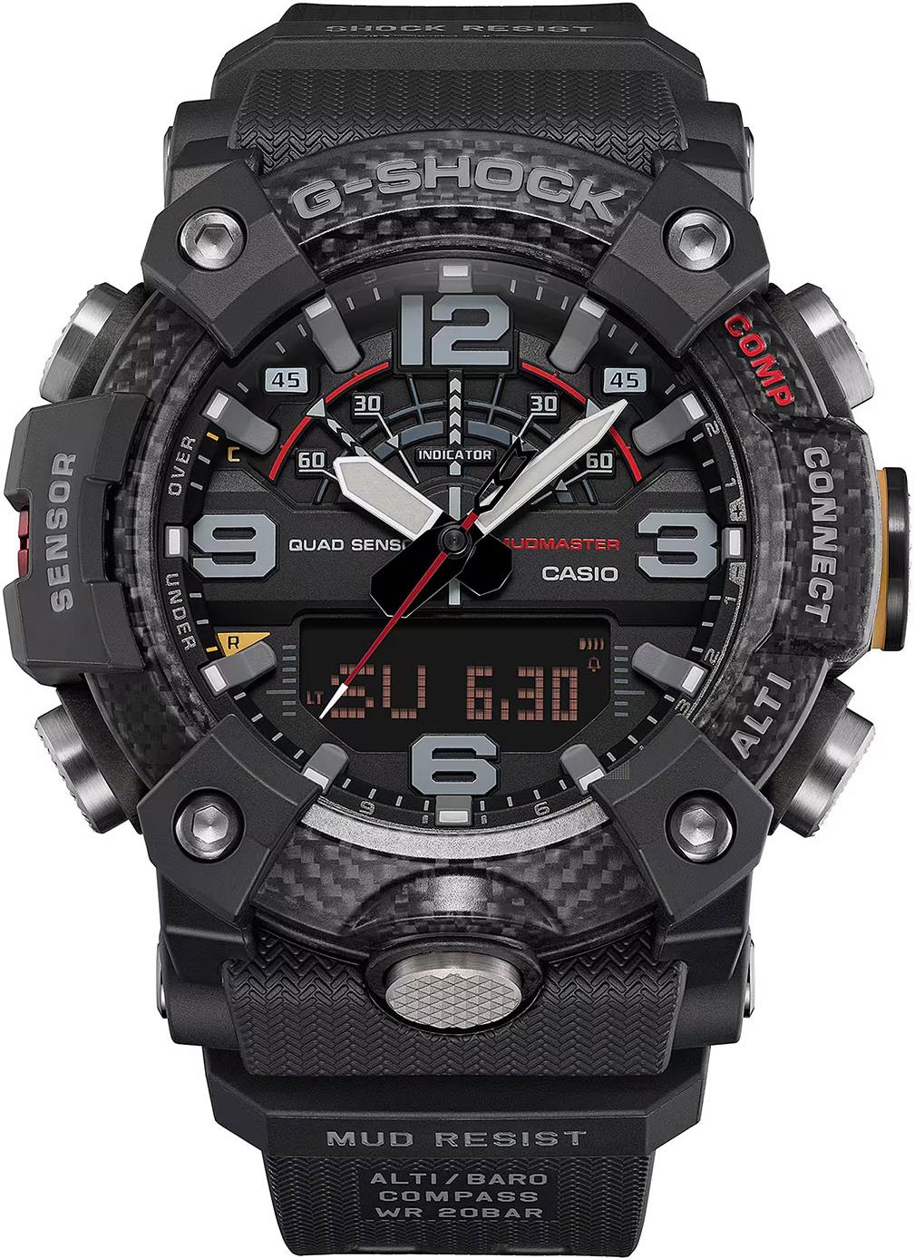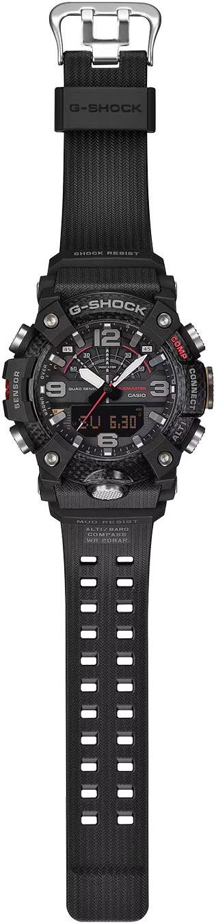 Master of G Mudmaster. Кварцевые мужские часы в корпусе с карбоновым усилением Carbon Core Guard, обеспечивающим исключительную ударопрочность и защиту от вибраций. Особая герметичная конструкция кнопок и корпуса надежно защищает механизм от попадания пыли и грязи. Модель оснащена технологией Bluetooth для синхронизации со смартфоном, автоматической корректировки времени и использования функций приложения CASIO WATCHES. Двойная светодиодная подсветка высокой яркости (Super Illuminator): отдельный светодиод для аналогового циферблата и отдельная подсветка для цифрового дисплея. Система оснащена функцией автоматического включения при наклоне руки к лицу, возможностью выбора длительности свечения (1,5 или 3 секунды) и режимом послесвечения. Цвет подсветки: белый.