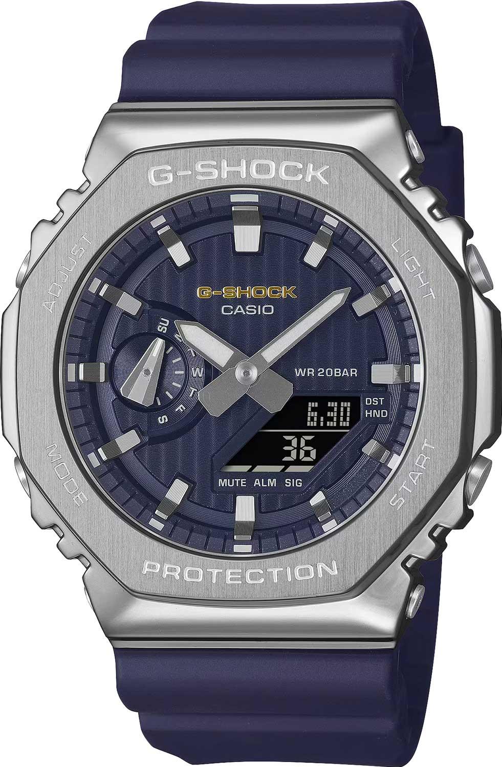 G-Shock. Мужские часы. Противоударный корпус защищает механизм от ударов и вибрации. Двойная подcветка: циферблат и ЖК-дисплеи подсвечиваются светодиодом, благодаря наличию функции задержки, после отпускания кнопки освещение горит еще несколько секунд. Настраиваемое послесвечение 1,5 или 3сек. Цвет подсветки: белый. Необритовое светонакопительное покрытие обеспечивает длительное послесвечение в темноте даже после кратковременного нахождения на свету. Имеется женский вариант модели GM-S2110SH-2A.
