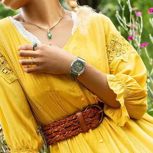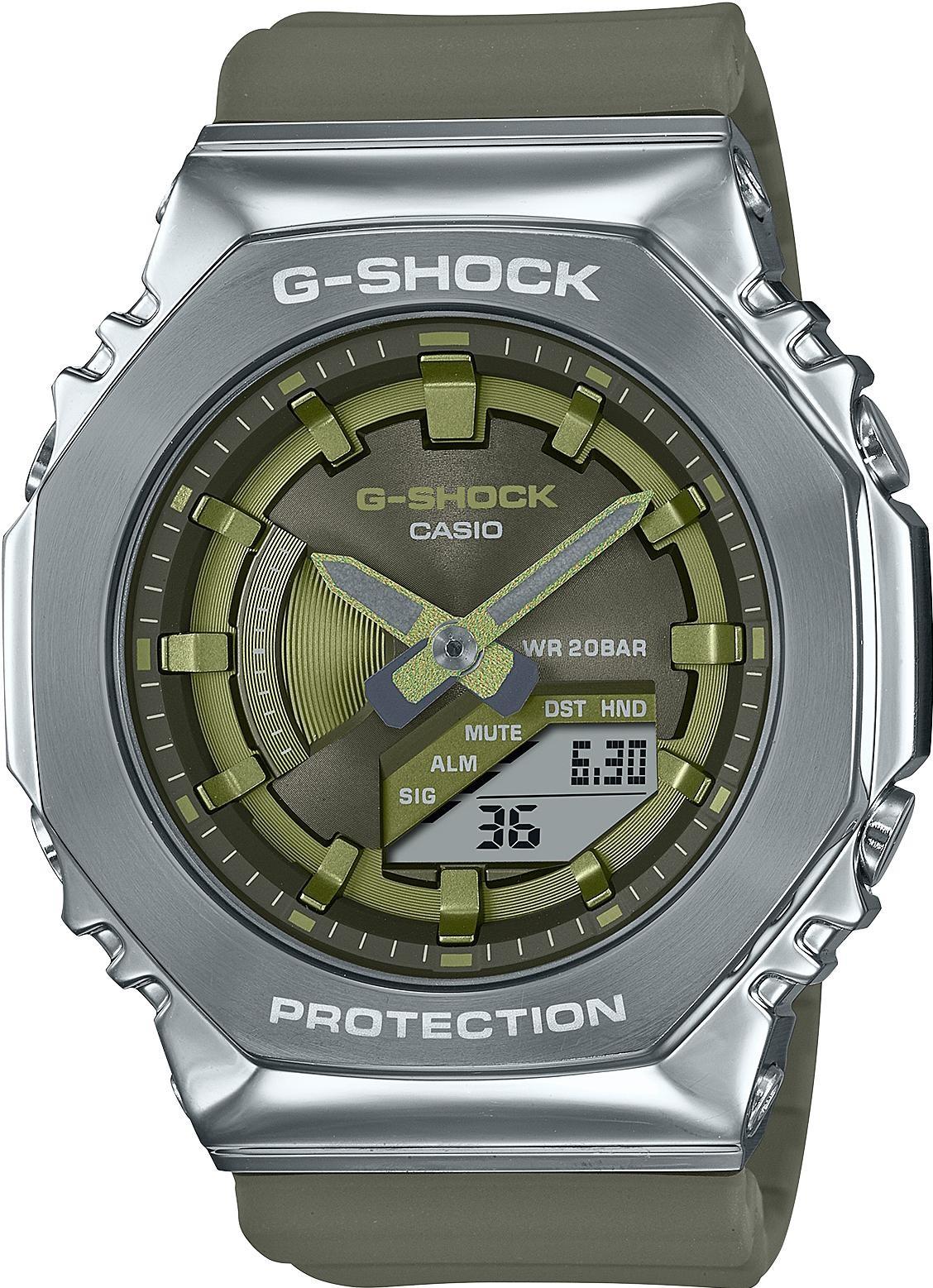 Женские кварцевые часы из серии G-Shock. Комбинированный круглый корпус из нержавеющей стали и карбона. Зеленый аналого-цифровой циферблат. Минеральное стекло. Водозащита 200 м. Пластиковый ремешок хаки с системой быстрой замены. Простая пряжка.