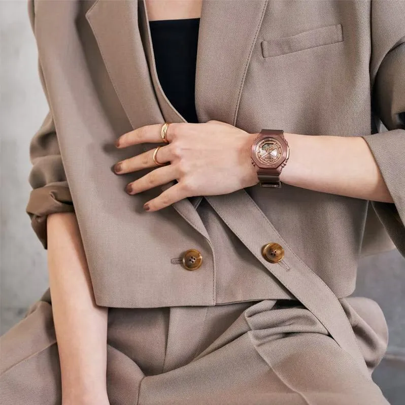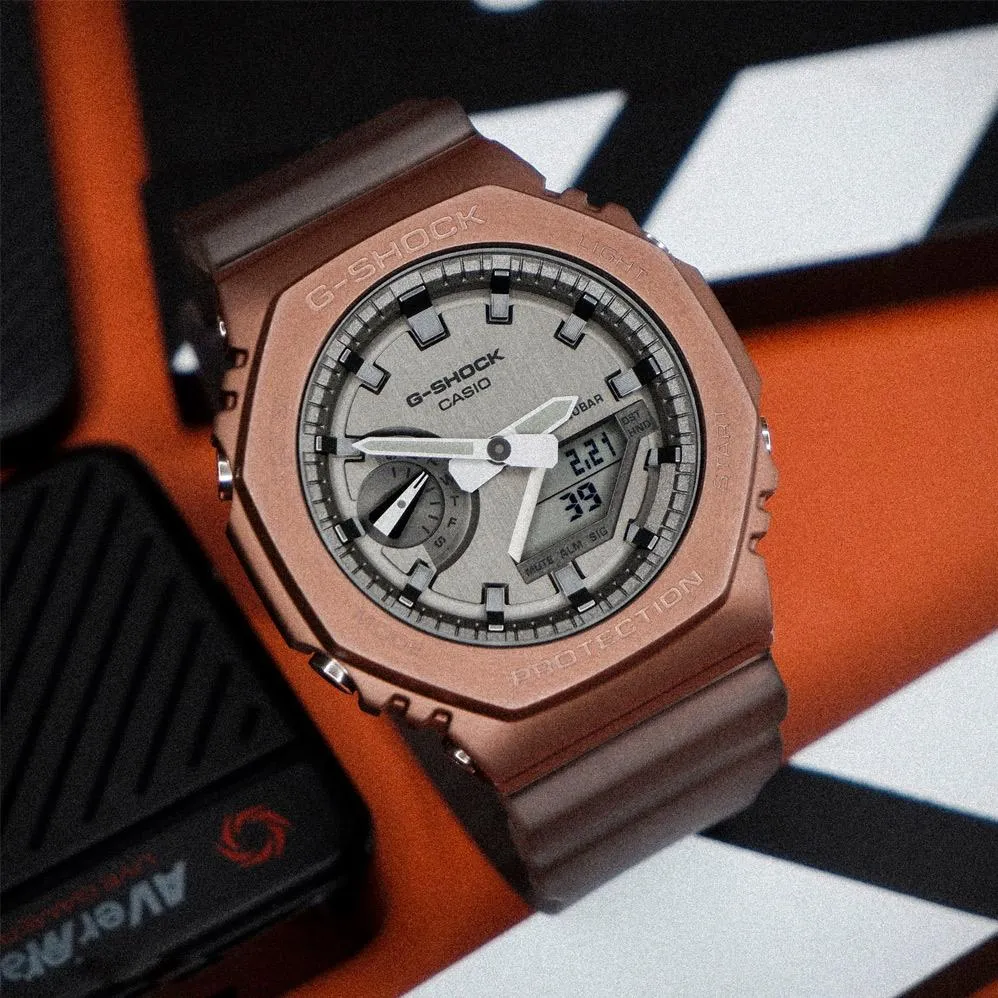 Мужские наручные часы Casio G-Shock GM-S2100BR-5A. Точный кварцевый механизм с аналого-цифровой индикацией. Полимерный ремешок. Натуральный полимерный материал является идеальным для изготовления ремешка благодаря своей чрезвычайной прочности и гибкости. После настройки автоматический календарь всегда отображает точную дату. Аккумулятор обеспечивает часы достаточным питанием приблизительно на 3 года. Функция будильника. Функция хронографа. Отображение текущего времени в основных городах и конкретных областях по всему миру. Функция таймера. Таймеры обратного отсчета напомнят Вам о текущих или особенных событиях, издав звуковой сигнал в установленное время. Ударопрочная конструкция часов защищает от ударов и вибрации. Отображение времени возможно в 12-часовом или 24-часовом формате. Полимерный ремешок. Натуральный полимерный материал является идеальным для изготовления ремешка благодаря своей чрезвычайной прочности и гибкости. Браслет из нержавеющей стали. Прочное, устойчивое к царапинам минеральное стекло защищает часы от повреждений. На циферблате отображается текущее число, месяц и день недели. Часы являются водонепроницаемыми до 20 Бар. Цвет циферблата: Розовое золото. Цвет корпуса: Золотистый. Светодиодная подсветка. На стрелки и отметки нанесен светонакопительный состав, благодаря этому считывать информацию с циферблата возможно и в темноте. Толщина: 11 мм. Гарантия: 2 года.