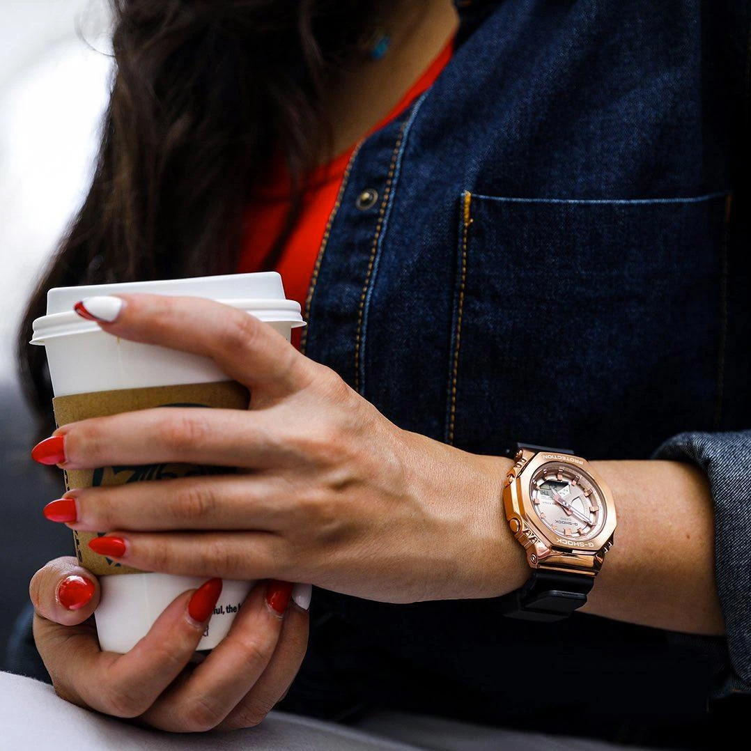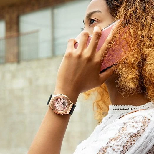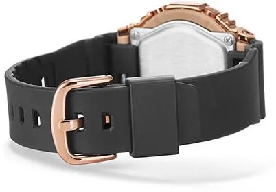 Женские кварцевые часы из серии G-Shock. Комбинированный круглый корпус из стали с покрытием и пластика. Золотистый аналого-цифровой циферблат. Минеральное стекло. WR 200 м. Пластиковый черный ремешок с системой быстрой замены. Простая пряжка.