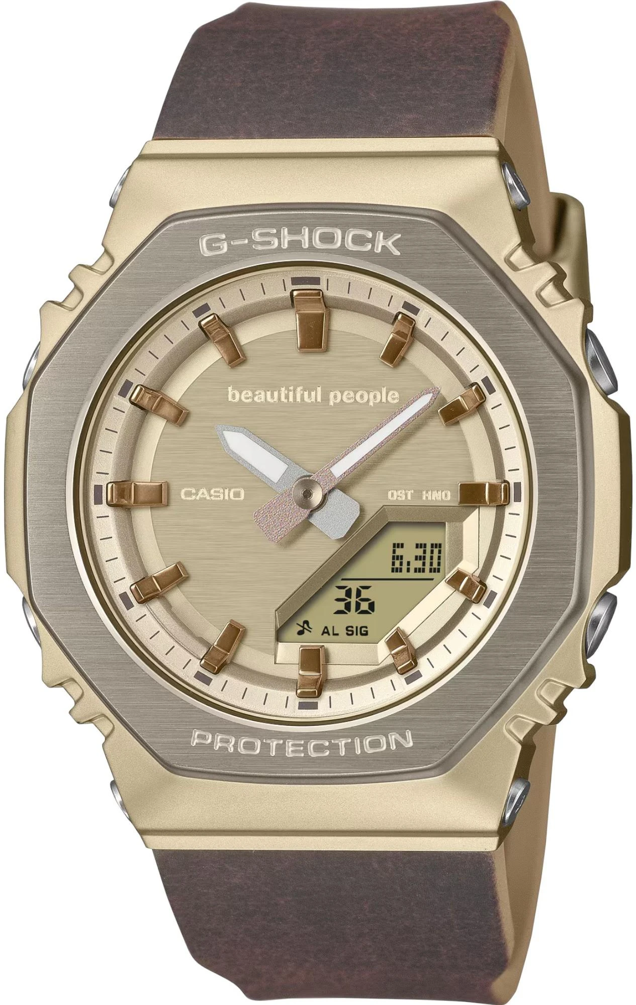 Унисекс часы beautiful people x G-Shock. Модель создана совместно с японским брендом beautiful people, который был основан в 2006 году дизайнером Хиденори Кумакири. Ремешок и частично корпус выполнены из биопластика, который изготавливается из возобновляемых органических ресурсов. Противоударный корпус защищает механизм от ударов и вибрации. Двойная подcветка: циферблат и ЖК-дисплеи подсвечиваются светодиодом, благодаря наличию функции задержки, после отпускания кнопки освещение горит еще несколько секунд. Настраиваемое послесвечение 1,5 или 3сек. Цвет подсветки: белый. Необритовое светонакопительное покрытие обеспечивает длительное послесвечение в темноте даже после кратковременного нахождения на свету. 12-ти и 24-х часовой формат времени. Секундомер с двумя точностями показаний: 1/100с (до 1ч) и 1с (после 1ч) и временем измерения 24ч. Режимы измерения: прошедшее время, промежуточное время, время 1-го и 2-го места. Таймер обратного отсчета от 1с до 24ч. 5 будильников, ежечасный сигнал. Автоматический календарь (до 2099 года). Мировое время – 48 городов (31 часовой пояс), всемирное координированное время (UTC). Функции включения/отключения летнего времени, отключения/включения звука и перемещения стрелок для беспрепятственного просмотра информации на цифровом дисплее. Батарейка рассчитана на 3 года. Стальная задняя крышка крепится на 4-х винтах. Ремешок с классической застежкой.