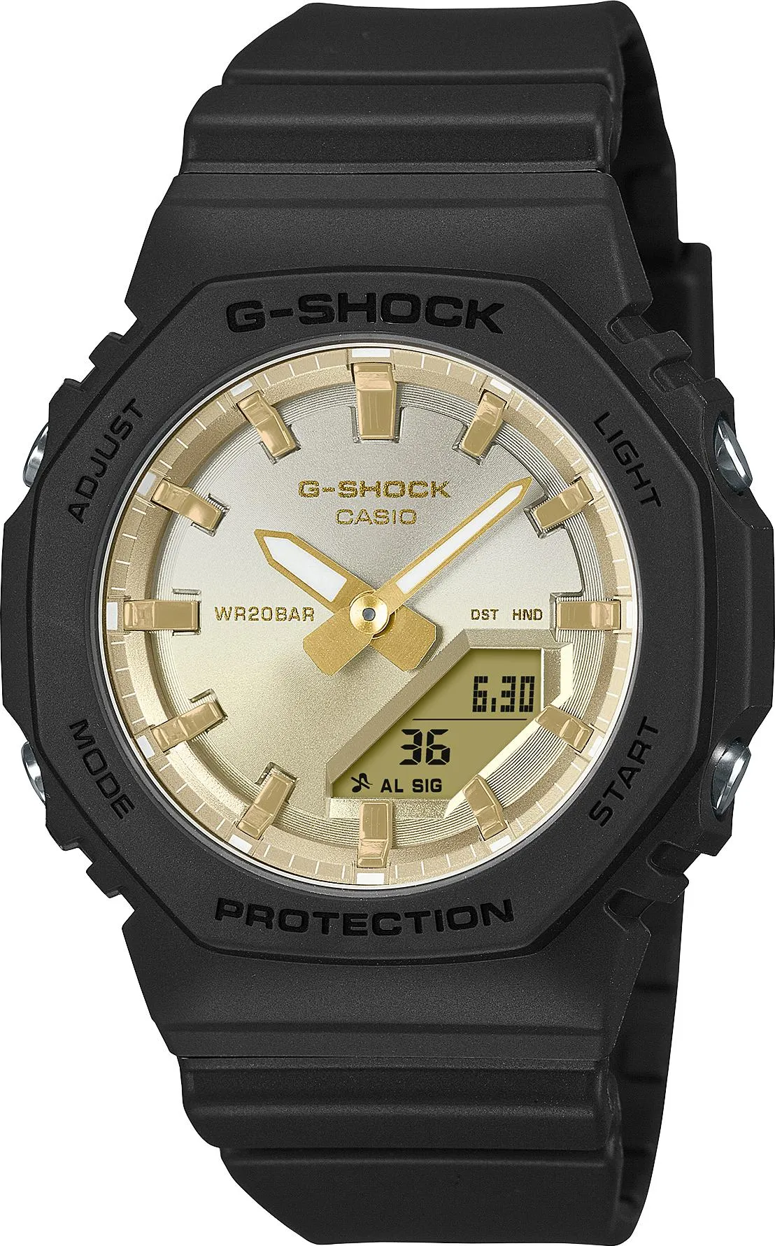 Женские наручные часы Casio G-Shock GMA-P2100SG-1A. Точный кварцевый механизм с аналого-цифровой индикацией. Полимерный ремешок. Натуральный полимерный материал является идеальным для изготовления ремешка благодаря своей чрезвычайной прочности и гибкости. Отображение текущего времени в основных городах и конкретных областях по всему миру. Функция будильника. Функция хронографа. Функция таймера. Таймеры обратного отсчета напомнят Вам о текущих или особенных событиях, издав звуковой сигнал в установленное время. Для подсветки дисплея используется светодиод, а так же имеет функцию автоматического включения подсветки, если Вы наклоните часы к своему лицу. После настройки автоматический календарь всегда отображает точную дату. Полимерный ремешок. Натуральный полимерный материал является идеальным для изготовления ремешка благодаря своей чрезвычайной прочности и гибкости. Прочное, устойчивое к царапинам минеральное стекло защищает часы от повреждений. На циферблате отображается текущее число, месяц и день недели. Часы являются водонепроницаемыми до 20 Бар. Цвет циферблата: Черный. Цвет корпуса: Золотистый. Светодиодная подсветка. Толщина: 11 мм. Гарантия: 2 года.