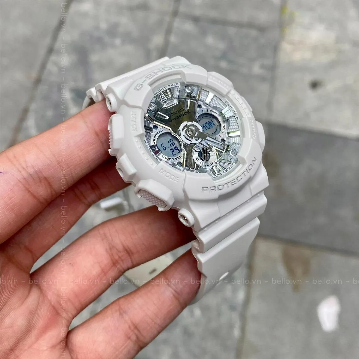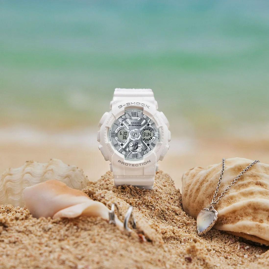 Мужские наручные часы Casio G-Shock GMA-S120VA-7A. Точный кварцевый механизм с аналого-цифровой индикацией. Полимерный ремешок. Натуральный полимерный материал является идеальным для изготовления ремешка благодаря своей чрезвычайной прочности и гибкости. Часы созданы с защитой от воздействия магнитных полей. Для подсветки дисплея используется светодиод, а так же имеет функцию автоматического включения подсветки, если Вы наклоните часы к своему лицу. Аккумулятор обеспечивает часы достаточным питанием приблизительно на 3 года. Функция будильника. Функция хронографа. Отображение текущего времени в основных городах и конкретных областях по всему миру. Функция таймера. Таймеры обратного отсчета напомнят Вам о текущих или особенных событиях, издав звуковой сигнал в установленное время. Ударопрочная конструкция часов защищает от ударов и вибрации. Отображение времени возможно в 12-часовом или 24-часовом формате. Полимерный ремешок. Натуральный полимерный материал является идеальным для изготовления ремешка благодаря своей чрезвычайной прочности и гибкости. Прочное, устойчивое к царапинам минеральное стекло защищает часы от повреждений. На циферблате отображается текущее число, месяц и день недели. Часы являются водонепроницаемыми до 20 Бар. Цвет циферблата: Белый. Цвет корпуса: Серебристый. Светодиодная подсветка. На стрелки и отметки нанесен светонакопительный состав, благодаря этому считывать информацию с циферблата возможно и в темноте. Толщина: 16 мм. Гарантия: 2 года.