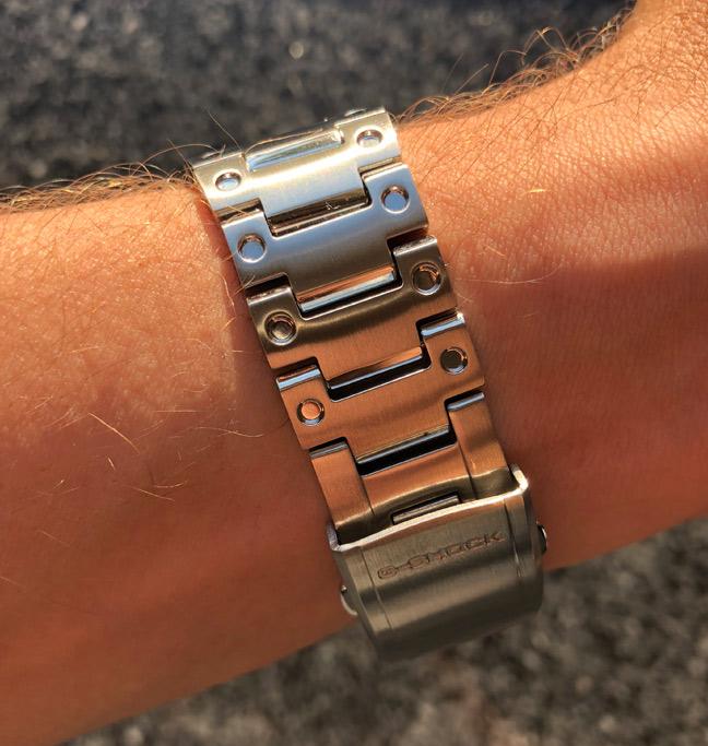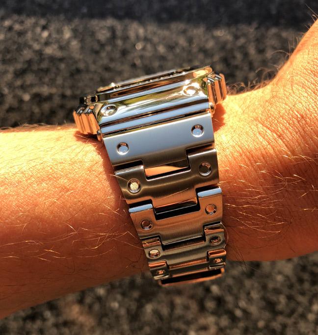 Внешний стальной корпус отполирован и выглядит хромированным, а на безеле сохранена стальная текстура. Внутри, гасящий любые удары, слой из материала Alpha Gel® и металлическая капсула с механизмом часов.