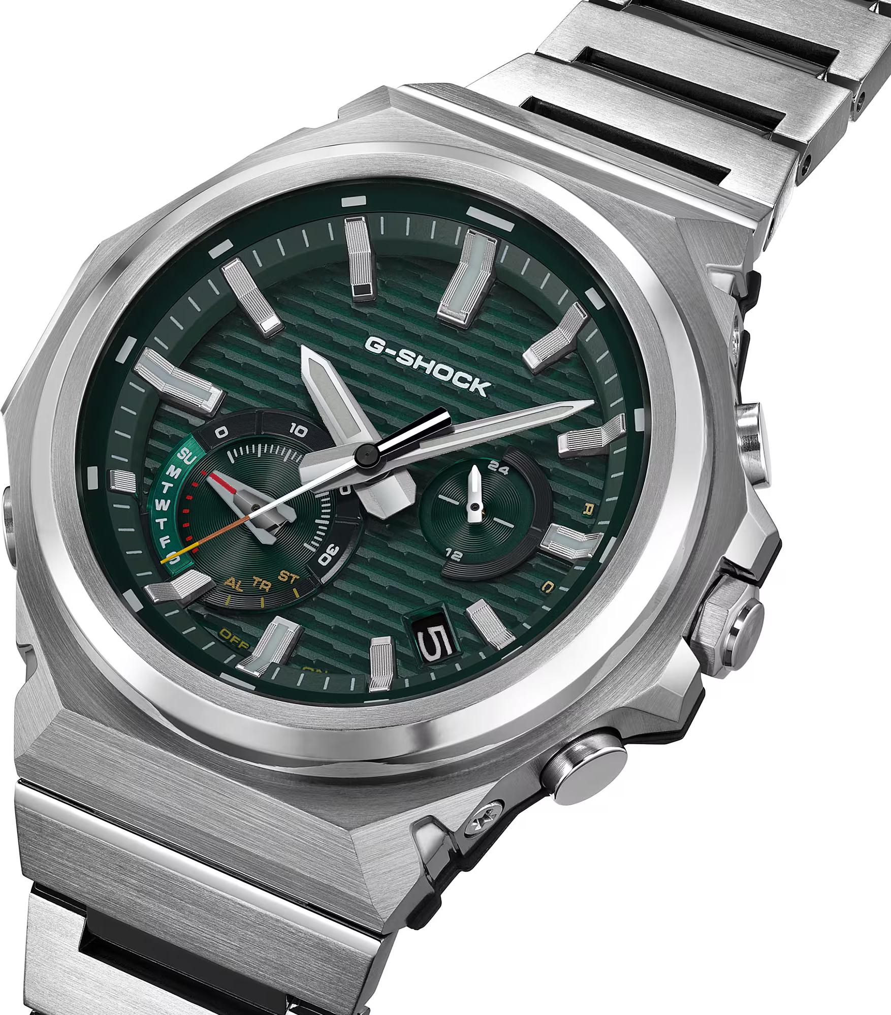 Мужские кварцевые часы на солнечной батарее. Запас хода при полном заряде — 5 месяцев, в режиме энергосбережения — 18 месяцев. Индикатор низкого заряда. Светодиодная подсветка с функцией послесвечения. Синхронизация со смартфоном с помощью Bluetooth. Центральные часовая, минутная и секундная стрелки. Апертура даты между 4 и 5 часами. Отображение дня недели. 12/24х часовой формат времени. Ежедневный будильник. Функция секундомера. Таймер. Автоматический календарь до 2099 года. Зеленый циферблат. Круглый корпус выполнен из карбона и нержавеющей стали. Размер корпуса составляет46,9 х 44,2 х 11,6 мм (ДхШхВ). Завинчивающаяся заводная головка. Стальной браслет, тройная раскладывающаяся застежка. Прочное минеральное стекло, устойчивое к мелким механическим повреждениям. Водостойкость WR 200 (погружение с аквалангом). Вес: 118 г.