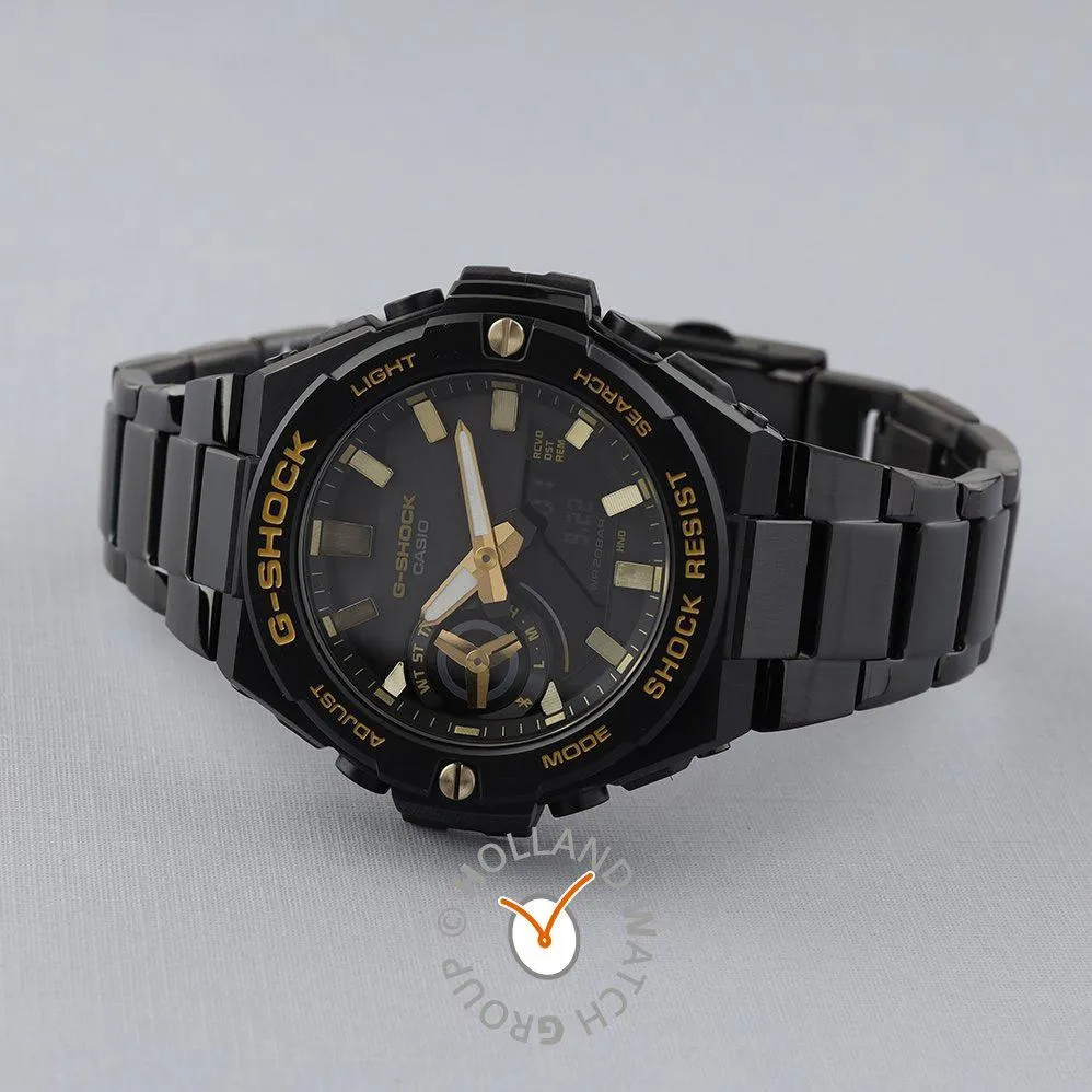 Мужские наручные часы Casio G-Shock GST-B500BD-1A9. Точный кварцевый механизм с аналого-цифровой индикацией. Корпус изготовлен из высококачественной нержавеющей стали 316L с высокими антикоррозийными свойствами. Светодиодная подсветка. На циферблате отображается текущее число, месяц и день недели. Ударопрочная конструкция часов защищает от ударов и вибрации. Солнечная батарейка. Солнечная подзаряжающаяся батарейка обеспечивает питание часов для работы. Функция Bluetooth позволяет удобно отображать все метрики с часов на экране смартфона, а также выводить на часы уведомления о входящих звонках, сообщениях и имейлах. Функция хронографа. Функция таймера. Таймеры обратного отсчета напомнят Вам о текущих или особенных событиях, издав звуковой сигнал в установленное время. Функция будильника. Индикатор запаса хода. Отображение текущего времени в основных городах и конкретных областях по всему миру. После настройки автоматический календарь всегда отображает точную дату. Отображение времени возможно в 12-часовом или 24-часовом формате. Браслет из нержавеющей стали. Прочное, устойчивое к царапинам минеральное стекло защищает часы от повреждений. Часы являются водонепроницаемыми до 20 Бар. Цвет корпуса: Черный. Цвет циферблата: Черный. Ширина (с заводной головкой): 46мм. Толщина: 13мм. Гарантия: 2 года. Другие наименования модели: GST-B500BD-1A9ER, GST-B500BD-1A9DR.