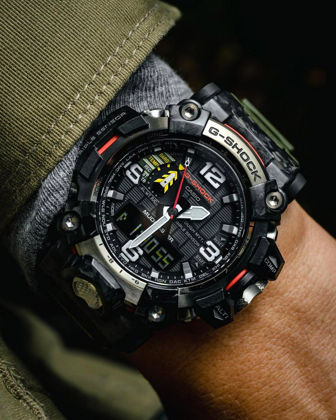 Компания CASIO представляет пополнение своей профессиональной коллекции Master of G - новую модель в рамках серии MUDMASTER, созданной для "покорителей Земли" и отличающуюся повышенной защитой от попадания грязи и пыли, - часы GWG-2000. Модель GWG-2000 унаследовала многое от своих предшественника - модели GWG1000. Новые технологии при создании корпуса на базе использования углеродного волокна позволили применить новую технологию строения корпуса "Carbon Core Guard". Использование кованого карбона и применение углеродно-усиленных полимеров позволило создать более компактный корпус в сравнении с предшественником. Сочетание новой структуры корпуса и кнопок с трубчето-поршневой системой, усиленной силиконовыми вставками, еще надежнее защищает механизм от попадания даже самой мелкодисперсной пыли. Защитно-фиксирующие внешние накладки выполнены из сверхпрочного кованого карбона и являются независимыми элементами корпуса, их внешний вид будет уникален для каждой модели и подчеркивает надежность часов серии MUDMASTER. Часы имеют кнопки и ремешок со специальным анти-скользящим покрытием для удобства использования в условиях сильного загрязнения, тройной датчик (альтиметр, барометр, компас, термометр), солнечный аккумулятор - и многое другое новинка унаследовала о предшественников. Тройной датчик не только помогает ориентироваться в пространстве и отслеживать изменения в окружающей среде, но и позволяет делать прогноз погоды.
