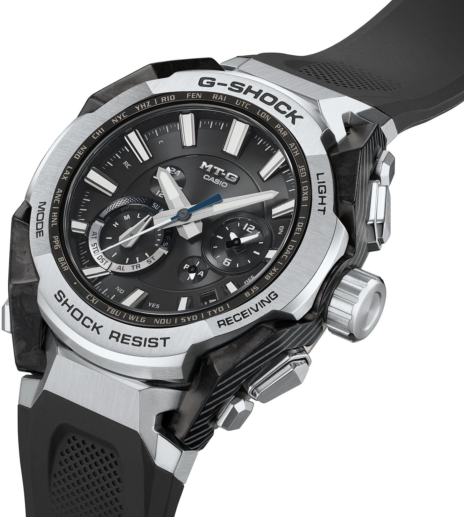 Часы G-Shock MTG-B4000 являют собой отличный пример синергии современного искусственного интеллекта и людей, творчески объединяющих свои возможности для создания продуктов, выходящих на новый уровень и раздвигающих привычные границы дизайна. Сложный объемный каркас часов выполнен из ламинированных листов карбона и стекловолокна, создавая необычный многослойный рисунок по краям корпуса. Стальные части безеля получили комбинированную обработку высочайшего уровня, совмещая зеркальные поверхности с изысканным текстурным сатинированием. Обновленный модуль часов надежно защищен карбоновым монококом по зарекомендовавшей себя технологии TRIPLE G RESIST от перегрузок, центробежной силы и различных, даже самых мощных вибраций. Присутствует и классическая для джишоков водозащита в 200 метров. Питаются часы от любого источника света благодаря встроенной солнечной батарее. Точность времени хода достигается гибридной системой: автоматической синхронизацией по 6-канальному радио-сигналу с атомными часами на разных континентах и через связь со смартфоном посредством Bluetooth.
