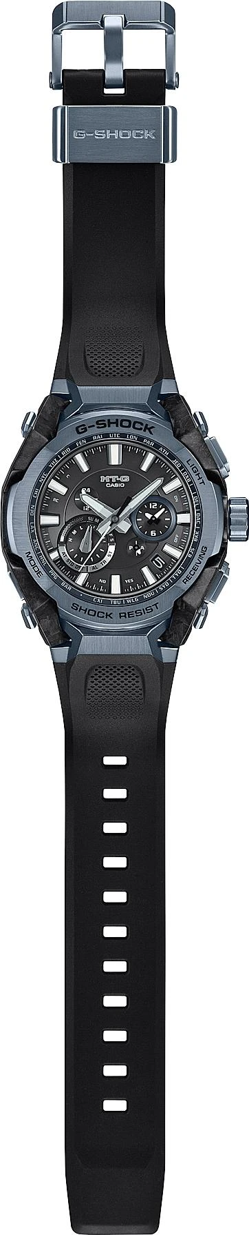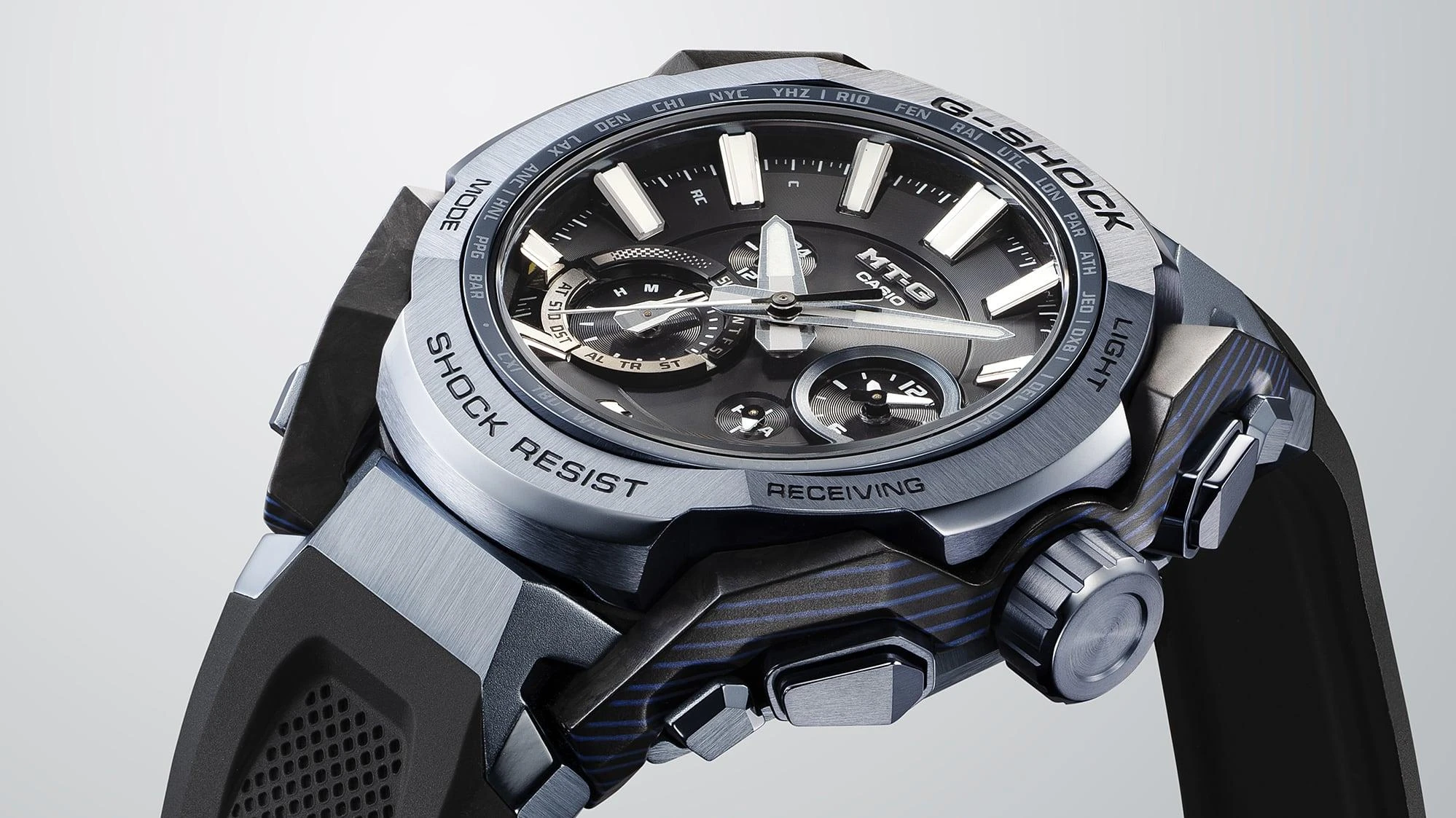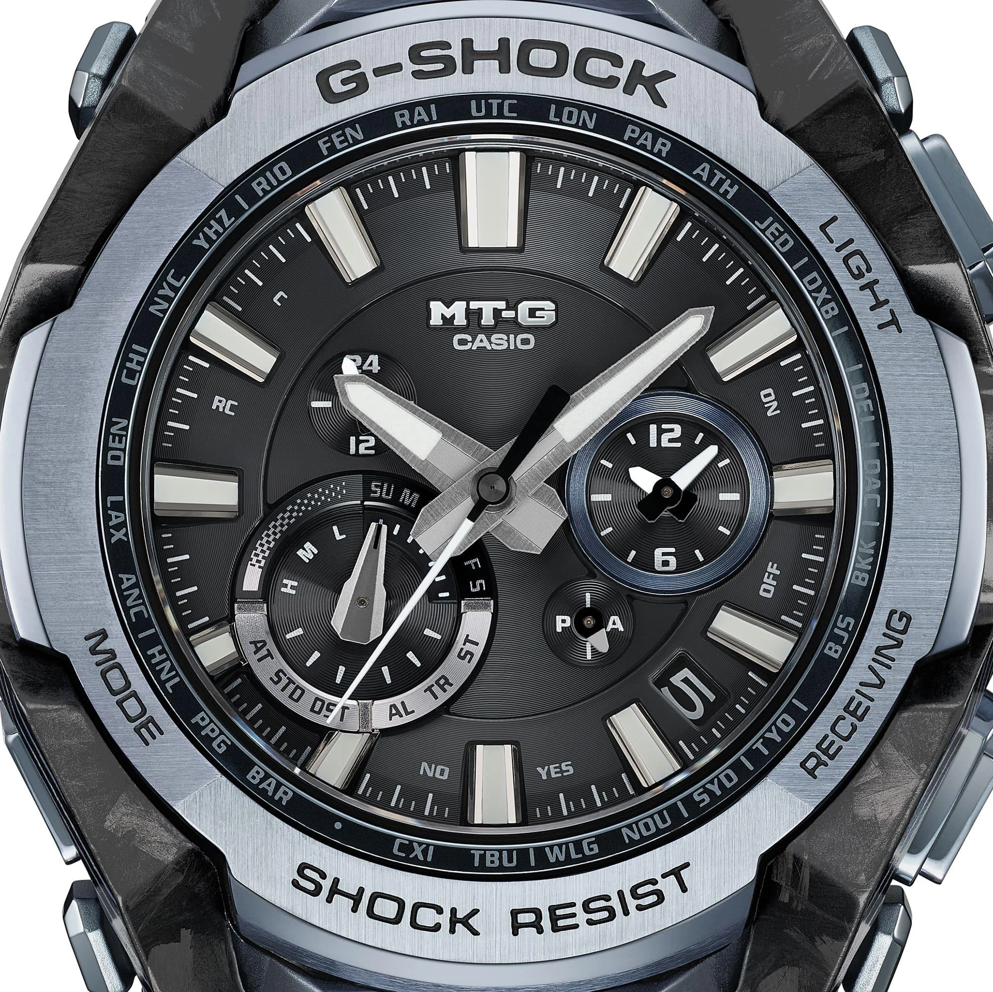 Часы G-Shock MTG-B4000 являют собой отличный пример синергии современного искусственного интеллекта и людей, творчески объединяющих свои возможности для создания продуктов, выходящих на новый уровень и раздвигающих привычные границы дизайна. Сложный объемный каркас часов выполнен из ламинированных листов карбона и стекловолокна, создавая необычный многослойный рисунок по краям корпуса. Стальные части безеля получили комбинированную обработку высочайшего уровня, совмещая зеркальные поверхности с изысканным текстурным сатинированием. Обновленный модуль часов надежно защищен карбоновым монококом по зарекомендовавшей себя технологии TRIPLE G RESIST от перегрузок, центробежной силы и различных, даже самых мощных вибраций. Присутствует и классическая для джишоков водозащита в 200 метров. Питаются часы от любого источника света благодаря встроенной солнечной батарее. Точность времени хода достигается гибридной системой: автоматической синхронизацией по 6-канальному радио-сигналу с атомными часами на разных континентах и через связь со смартфоном посредством Bluetooth.