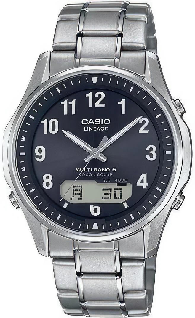 Мужские наручные часы Casio Lineage LCW-M100TSE-1A2. Точный кварцевый механизм с аналого-цифровой индикацией. В отличие от механических часов, не требуют завода и работают от батареи, показывая отклонение всего несколько секунд в месяц. Светодиодная подсветка обеспечивает равномерное и энергоэффективное освещение циферблата. Для активации обычно требуется нажатие отдельной кнопки, что позволяет экономить заряд батареи.На стрелки и отметки нанесен светонакопительный состав, благодаря этому считывать информацию с циферблата возможно и в темноте. Титановый браслет. В отличие от стальных, титановый значительно легче при сопоставимой прочности, что повышает комфорт при ношении. После настройки автоматический календарь всегда отображает точную дату. Функция будильника. Функция хронографа. Индикатор запаса хода. Отображение текущего времени в основных городах и конкретных областях по всему миру. Радио-синхронизация. Часы будут получать радио-сигнал калибровки, гарантирующий, что они всегда будут показывать точное время. Солнечная батарейка. Солнечная подзаряжающаяся батарейка обеспечивает питание часов для работы. Функция таймера. Таймеры обратного отсчета напомнят Вам о текущих или особенных событиях, издав звуковой сигнал в установленное время. Отображение времени возможно в 12-часовом или 24-часовом формате. Корпус изготовлен из высокопрочного титана. Сапфировое стекло. Искусственно изготовленное стекло с высокой прочностью и устойчивостью к царапинам. Часы являются водонепроницаемыми до 5 Бар. Цвет корпуса: Серебристый. Цвет циферблата: Черный. Высота (с ушками): 44 мм. Толщина: 9 мм. Гарантия: 2 года. Другие наименования модели: LCW-M100TSE-1A2ER, LCW-M100TSE-1A2R.