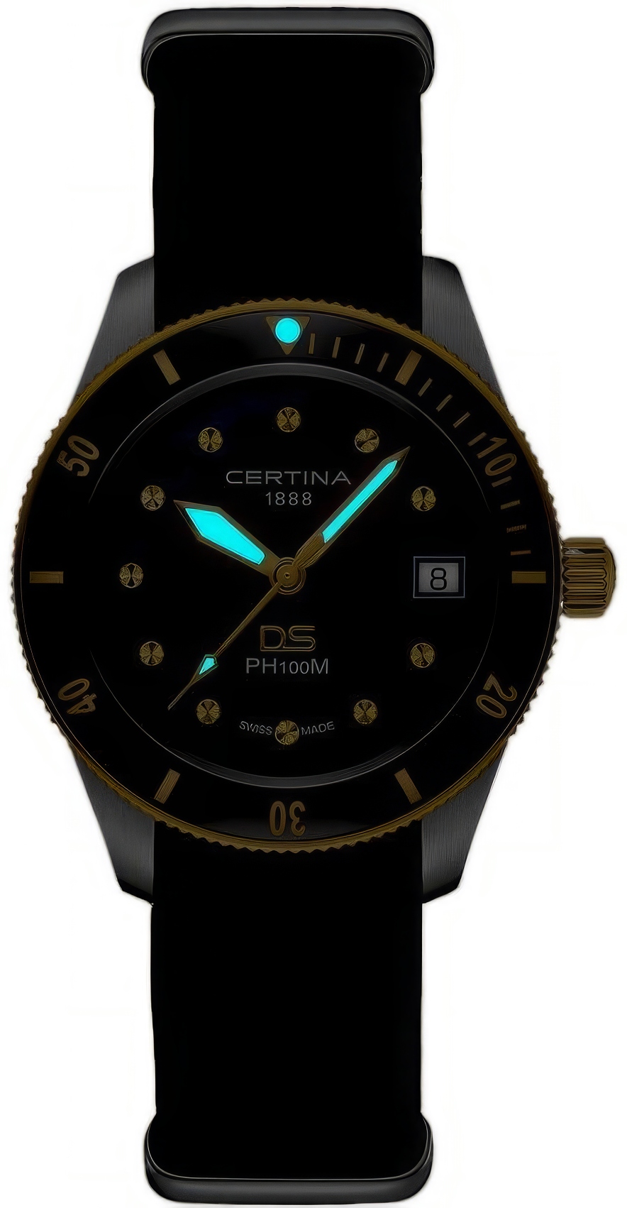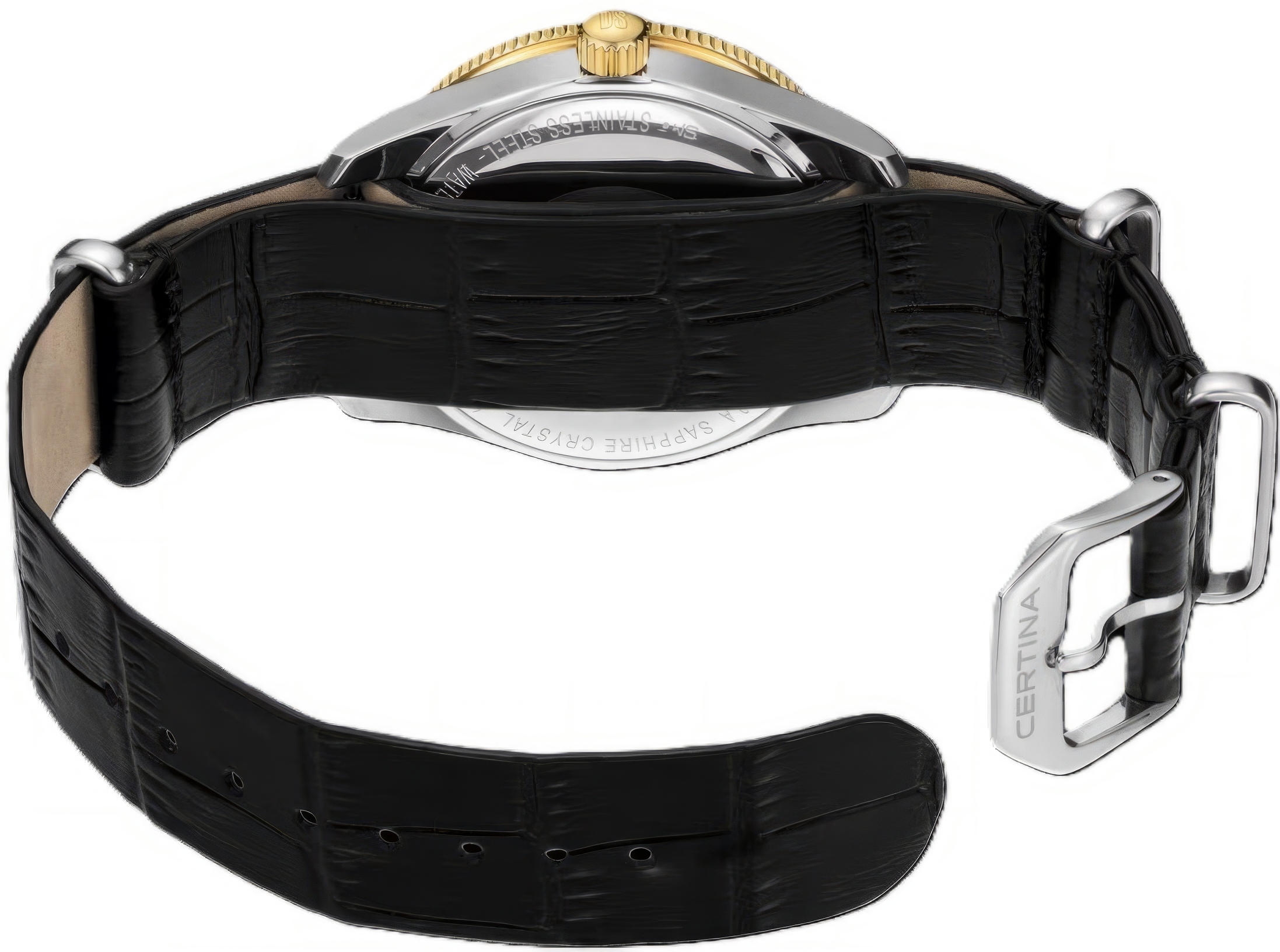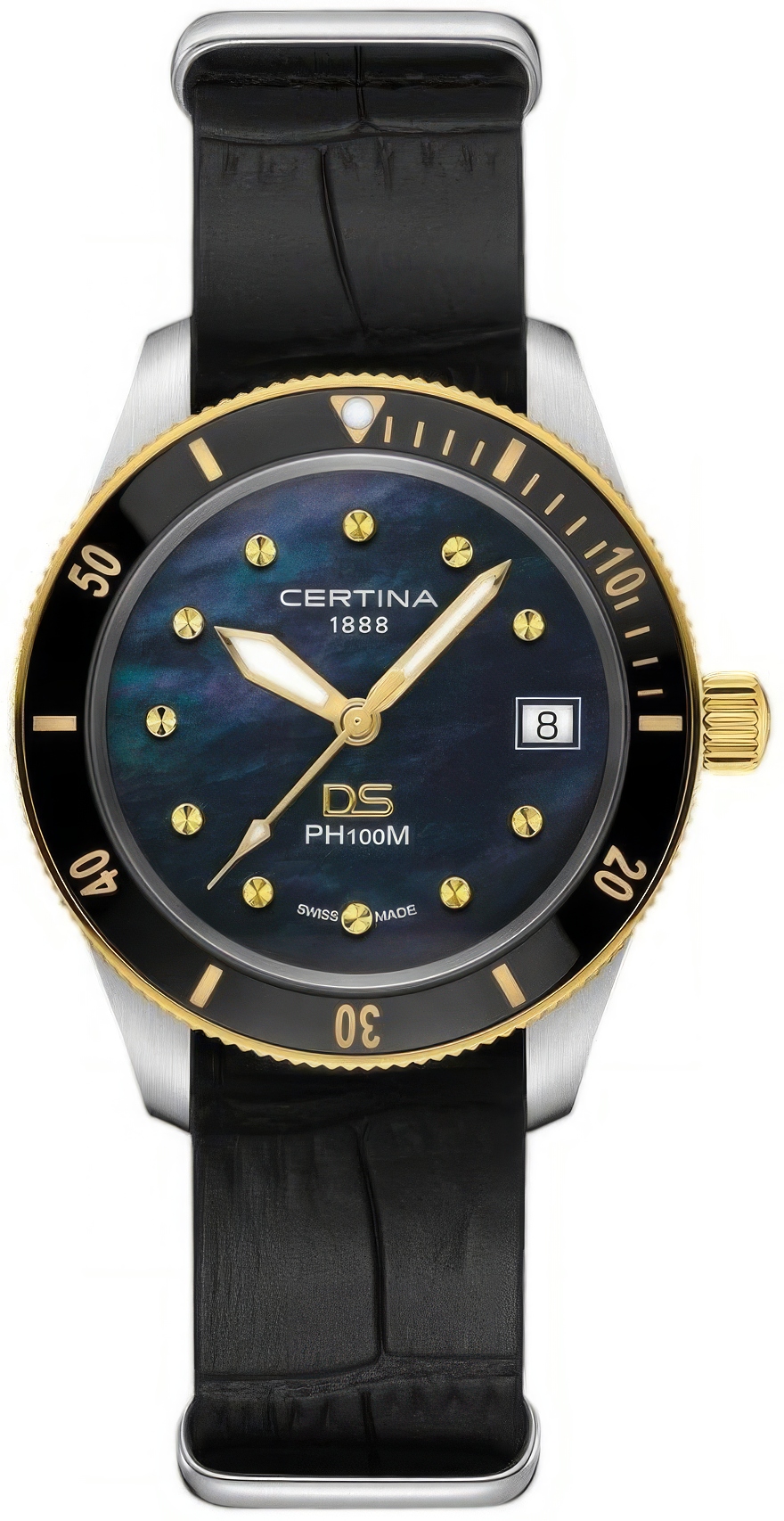 Швейцарские кварцевые женские часы Certina DS PH100M Lady C044.210.26.051.00 на кожаном ремешке сочетают современный женственный образ со знакомым ретродизайном. Фирменная технология PreciDrive обеспечивает погрешность не более +/-10 сек в год. Корпус изготовлен из нержавеющей стали 316L с PVD-покрытием: этот материал почти не подвержен ржавчине, потускнению и коррозии. Водозащита 100 метров (10 АТМ/bar): часы подходят для плавания и погружения на глубину 5-7 м (выдвигать заводную головку и нажимать кнопки, находясь в воде, нельзя). Покрытие Super-Luminova на стрелках и метке позволяет узнать время даже в темноте. Часы имеют указатель окончания срока службы элемента питания (EOL): когда секундная стрелка начинает двигаться с интервалами в 4 секунды, это сигнализирует о том, что элемент питания необходимо заменить в течение двух недель. Под прочным сапфировым стеклом с антибликовым покрытием расположен циферблат перламутрово-черного цвета с окошком даты в положении 3 часов. Эти женские наручные часы подходят как для повседневного использования, так и для особых или деловых событий, и станут прекрасным подарком на любой праздник.