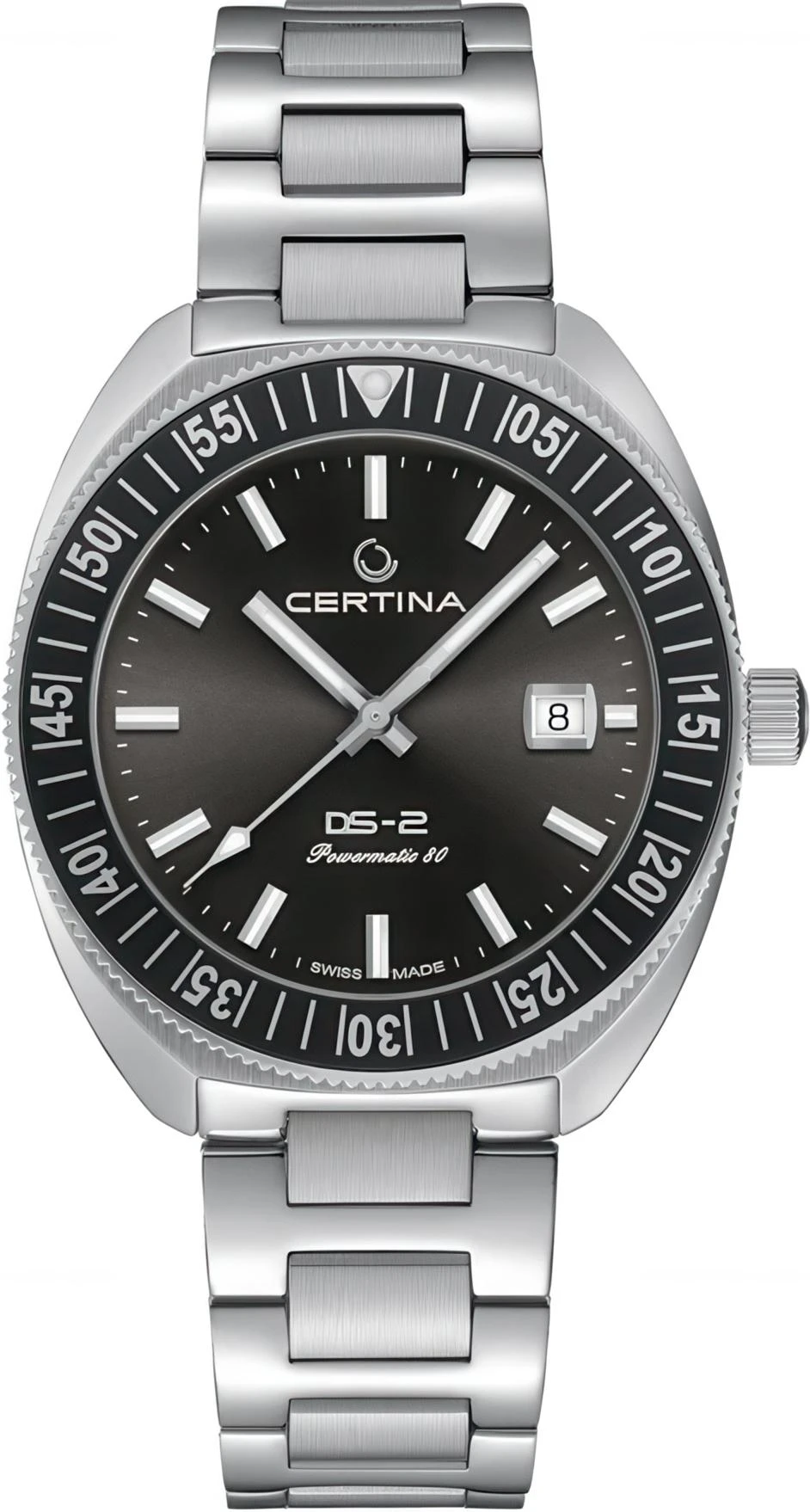 Certina Мужские швейцарские часы DS-2 C024.607.11.081.02. Механические с автоподзаводом. Пружина механизма заводится автоматически благодаря естественным движениям владельца в процессе ежедневной носки часов. На стрелки и отметки нанесен светонакопительный состав, благодаря этому считывать информацию с циферблата возможно и в темноте. Браслет из нержавеющей стали обладает высокой прочностью и износостойкостью, обеспечивая долговечность даже при активной эксплуатации. Материал устойчив к коррозии и сохраняет свой внешний вид надолго. Корпус изготовлен из высококачественной нержавеющей стали 316L с высокими антикоррозийными свойствами. Корпус изготовлен из высококачественного алюминиевого сплава. Сапфировое стекло. Искусственно изготовленное стекло с высокой прочностью и устойчивостью к царапинам. Часы являются водонепроницаемыми до 20 Бар. Цвет корпуса: Серебристый. Цвет циферблата: Черный. Высота (с ушками): 42 мм. Толщина: 12 мм. Гарантия: 2 года.