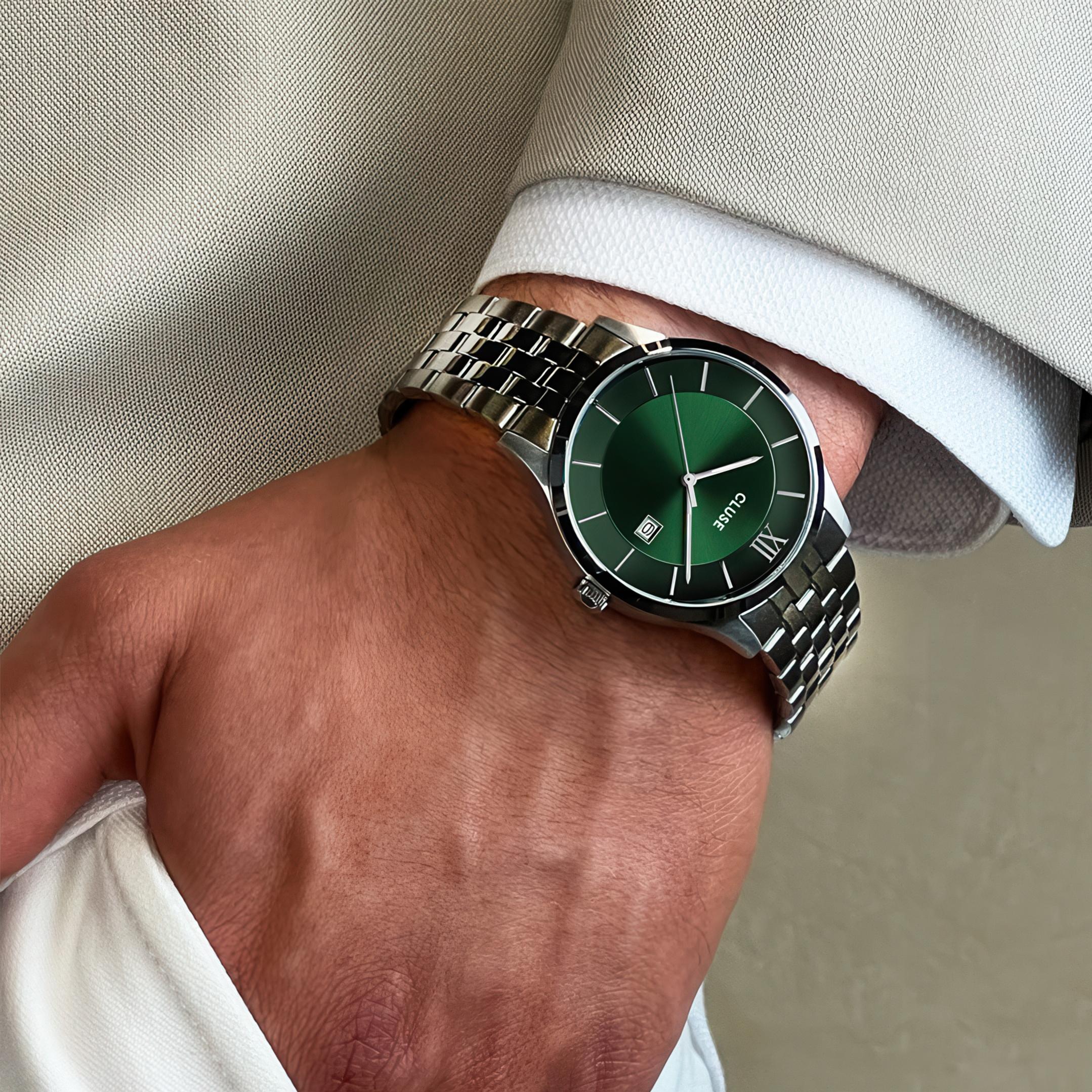 Мужские наручные часы Cluse Aravis CW22702. Точный кварцевый механизм с аналоговой индикацией. Браслет из нержавеющей стали. Браслет из нержавеющей стали. Прочное, устойчивое к царапинам минеральное стекло защищает часы от повреждений. На циферблате отображается текущее число месяца. Часы являются водонепроницаемыми до 5 Бар. Цвет циферблата: Серебристый. Цвет корпуса: Зеленый. Толщина: 7 мм. Гарантия: 2 года.