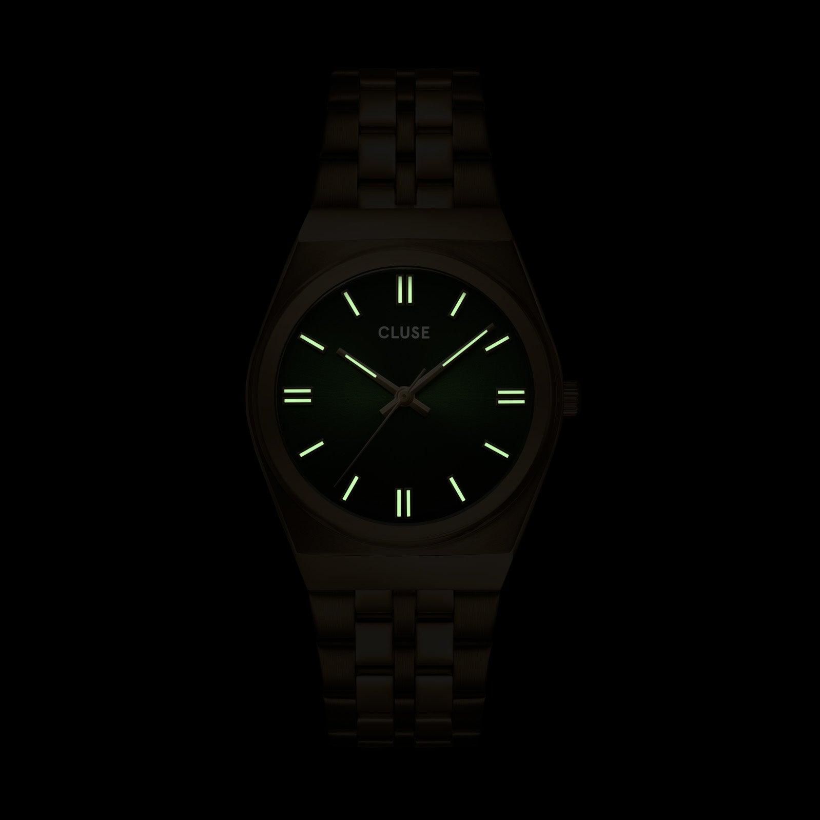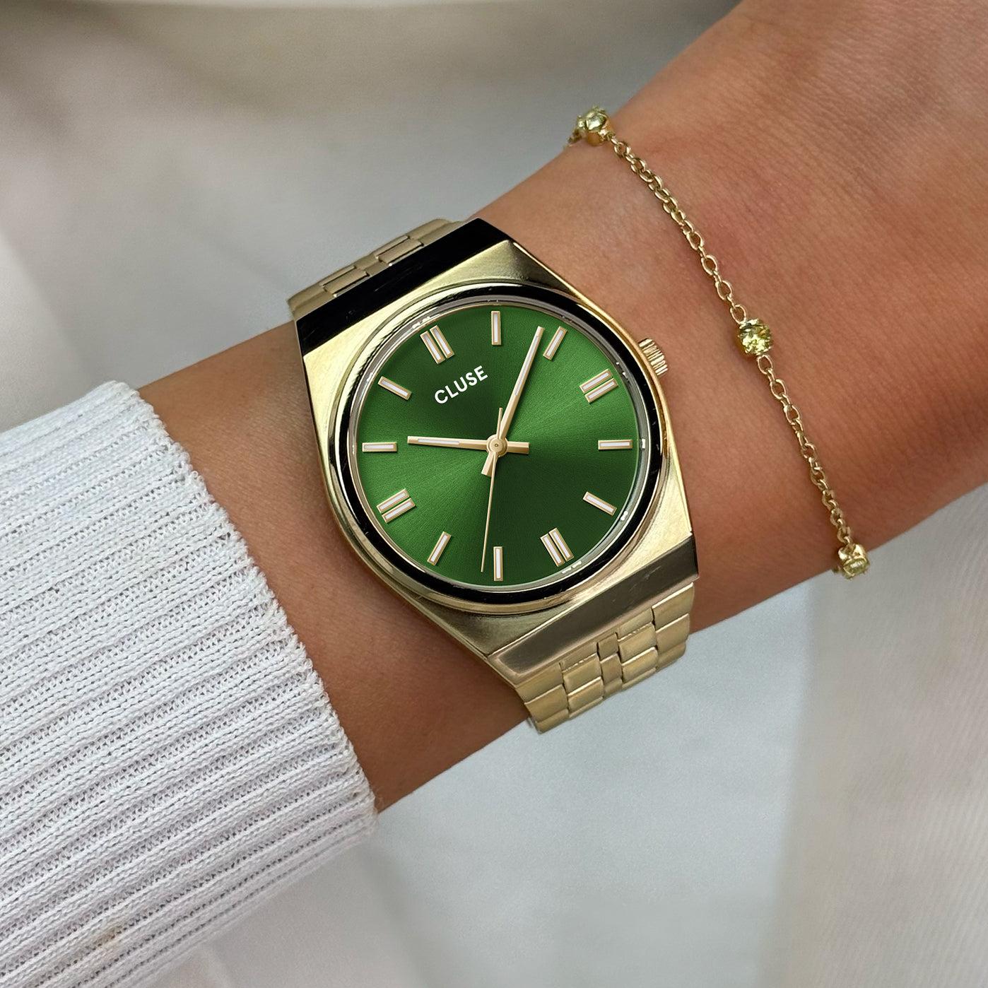 Круглые женские часы в стиле ретро 70-х годов имеют корпус золотистого цвета диаметром 33 мм, циферблат темно-зеленого цвета в винтажном стиле с золотыми стрелками и 5-звенный ремешок из нержавеющей стали золотистого цвета шириной 20 мм.