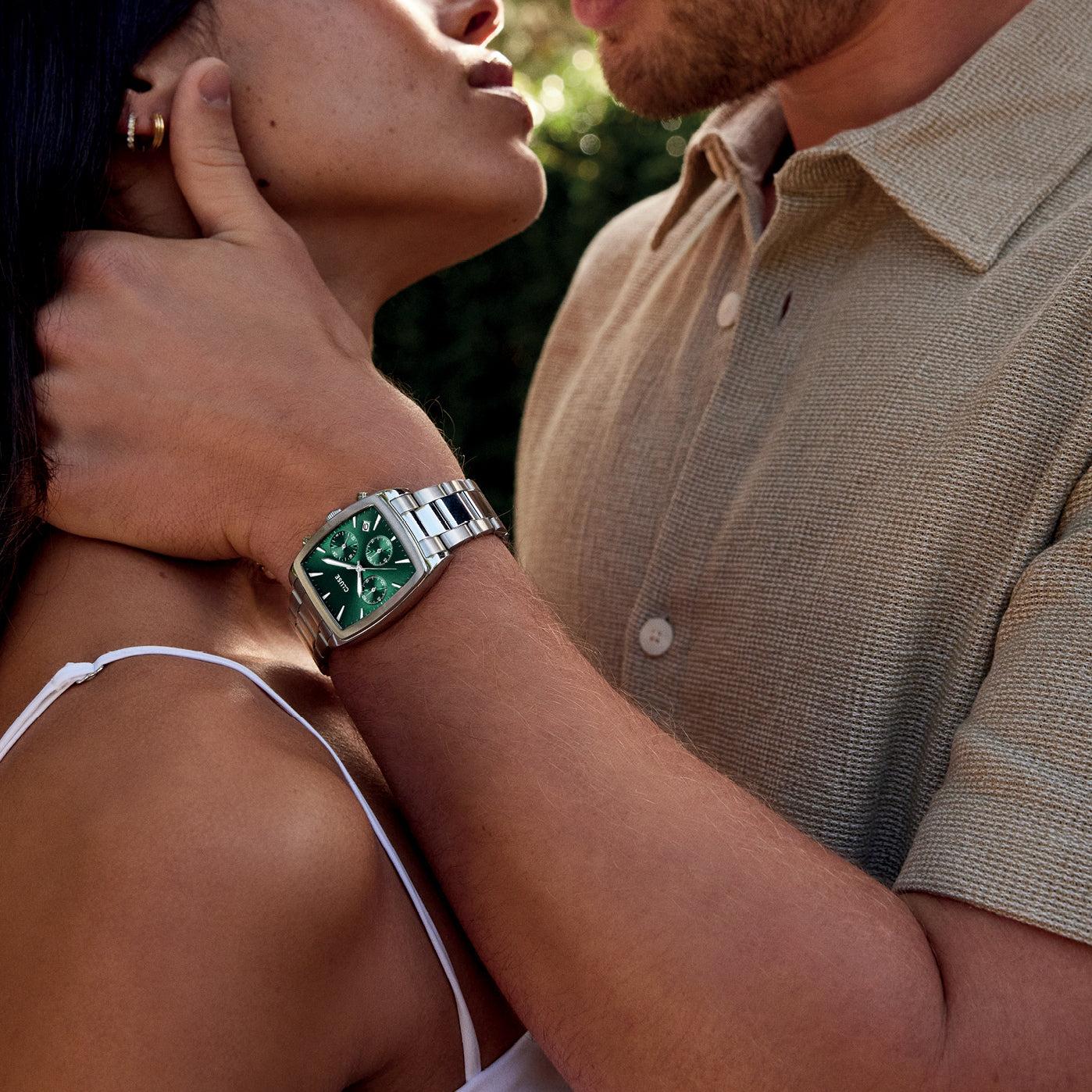 Мужские часы Quartaut Chrono — это уникальное сочетание надежности и роскоши. Модель отличается обтекаемым корпусом бочкообразной формы серебристого цвета, браслетом из нержавеющей стали с трехзвенной конструкцией и зеленым циферблатом с тремя дополнительными шкалами. Идеально проработанная форма обеспечивает непревзойденный комфорт и стиль.