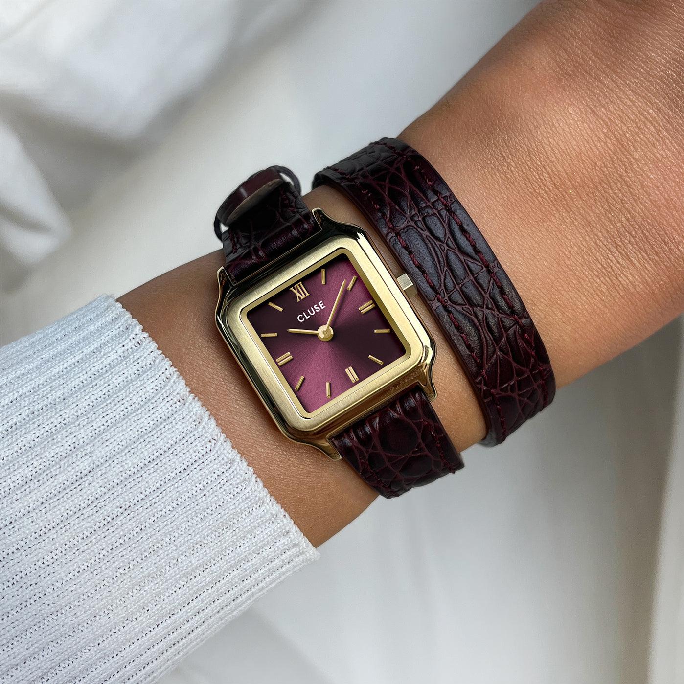 Квадратные женские часы Gracieuse Petite имеют корпус золотистого цвета диаметром 24 мм, циферблат бордового цвета и двойной ремешок шириной 14 мм из текстурированной кожи крокодила бордового цвета. Легко персонализируйте свои часы с помощью любого ремешка CLUSE шириной 14 мм.