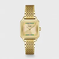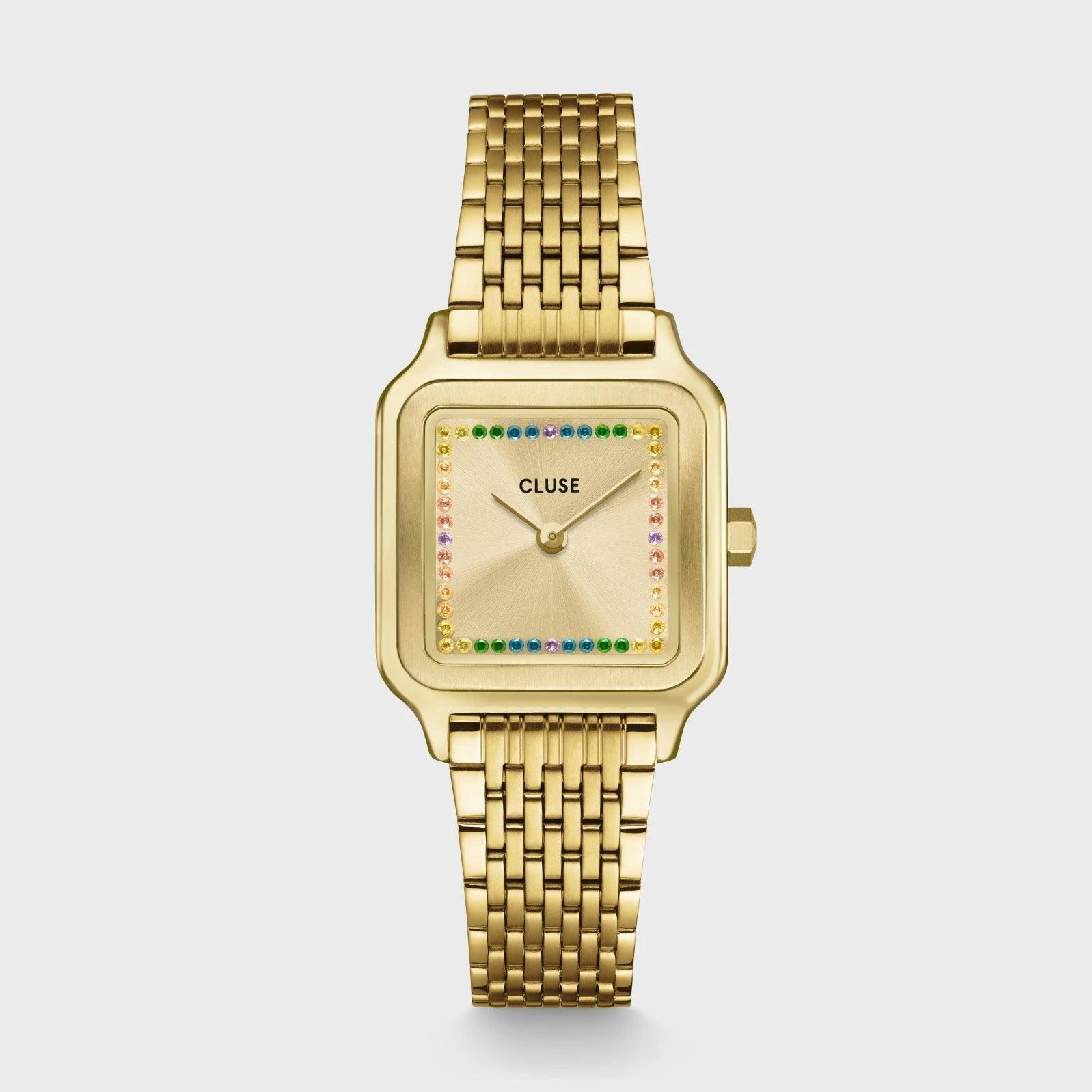 Квадратные женские часы Gracieuse Petite имеют корпус золотистого цвета диаметром 24 мм, циферблат золотистого цвета с разноцветными камнями и ремешок из нержавеющей стали золотистого цвета шириной 14 мм. Легко персонализируйте свои часы с помощью любого ремешка CLUSE шириной 14 мм.
