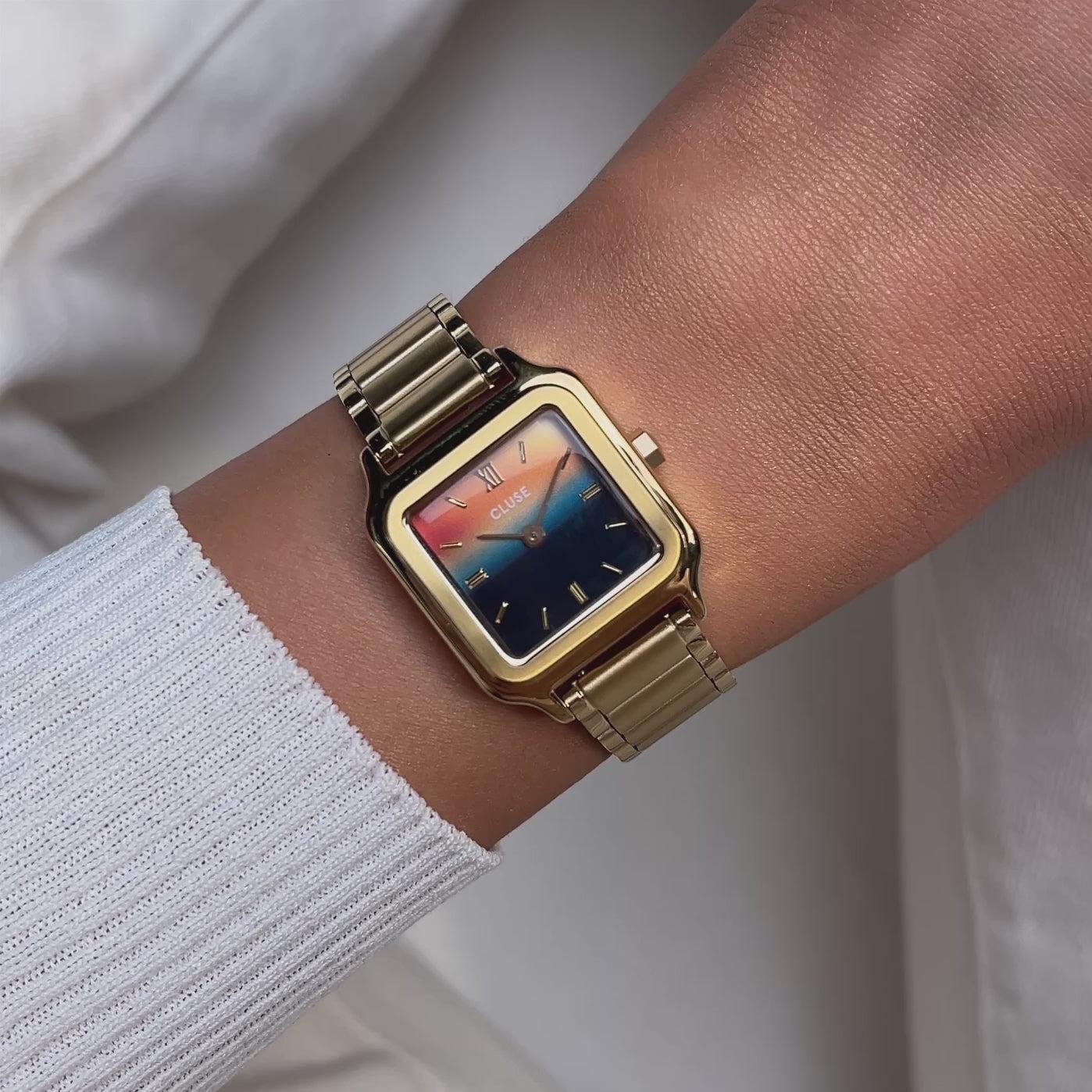 Квадратные женские часы Gracieuse Petite имеют корпус золотистого цвета диаметром 24 мм, циферблат с изображением заката и ремешок из нержавеющей стали золотистого цвета шириной 14 мм. Легко персонализируйте свои часы с помощью любого ремешка CLUSE шириной 14 мм.