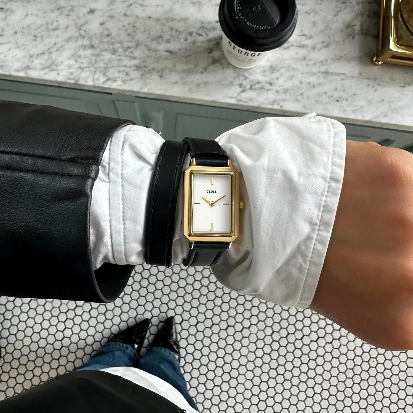 Женские наручные часы Cluse Fluette CW11513. Точный кварцевый механизм с аналоговой индикацией. Ремешок изготовлен из кожи. Браслет из нержавеющей стали. Прочное, устойчивое к царапинам минеральное стекло защищает часы от повреждений. Часы являются водонепроницаемыми до 5 Бар. Цвет циферблата: Желтое золото. Цвет корпуса: Черный. Толщина: 31 мм. Гарантия: 2 года.