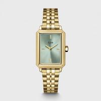 Элегантные женские часы Fluette с прямоугольным корпусом 30,6 мм золотистого цвета. Модель дополнена циферблатом нежного шалфейного оттенка и пятизвенным браслетом из нержавеющей стали шириной 14 мм в тон корпусу.