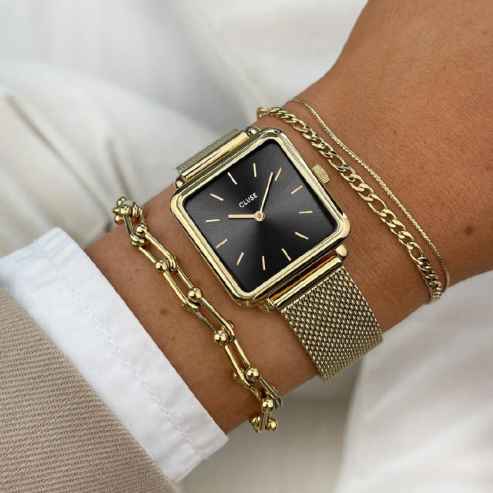 Женские наручные часы Cluse La Tetragone CW10308. Точный кварцевый механизм с аналоговой индикацией. Корпус изготовлен из высококачественной нержавеющей стали 316L с высокими антикоррозийными свойствами. Браслет из нержавеющей стали. Прочное, устойчивое к царапинам минеральное стекло защищает часы от повреждений. Часы являются водонепроницаемыми до 3 Бар. Цвет корпуса: Желтое золото. Цвет циферблата: Черный. Ширина (с заводной головкой): 28мм. Толщина: 7мм. Гарантия: 2 года.