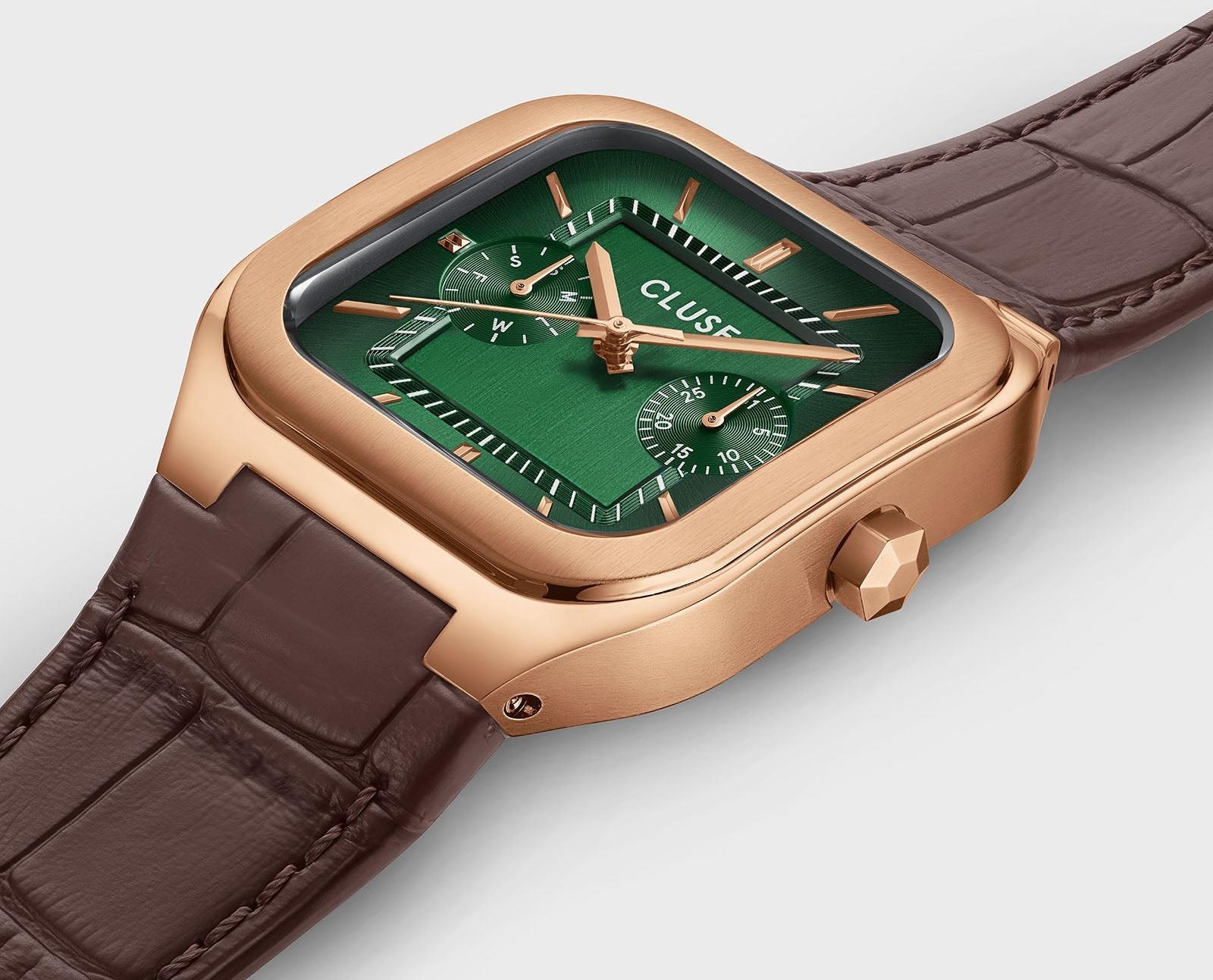 . Точный кварцевый механизм с аналоговой индикацией. В отличие от механических часов, не требуют завода и работают от батареи, показывая отклонение всего несколько секунд в месяц. Ремешок изготовлен из кожи. Гибкость такого ремешка позволяет точно регулировать посадку часов на руке. Корпус изготовлен из высококачественной нержавеющей стали 316L с высокими антикоррозийными свойствами. Прочное, устойчивое к царапинам минеральное стекло защищает часы от повреждений. Часы являются водонепроницаемыми до 5 Бар. Цвет корпуса: Розовое золото. Цвет циферблата: Зеленый. Высота (с ушками): 41 мм. Толщина: 9 мм. Гарантия: 2 года.