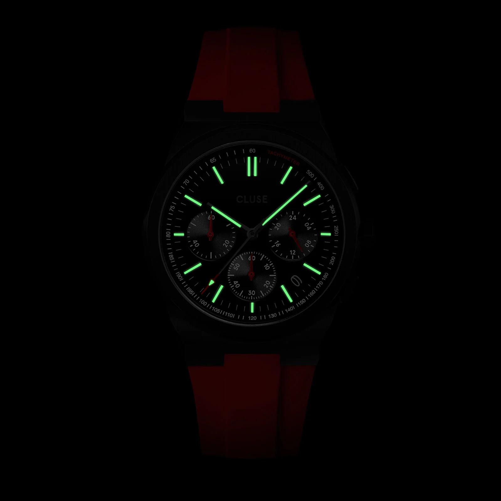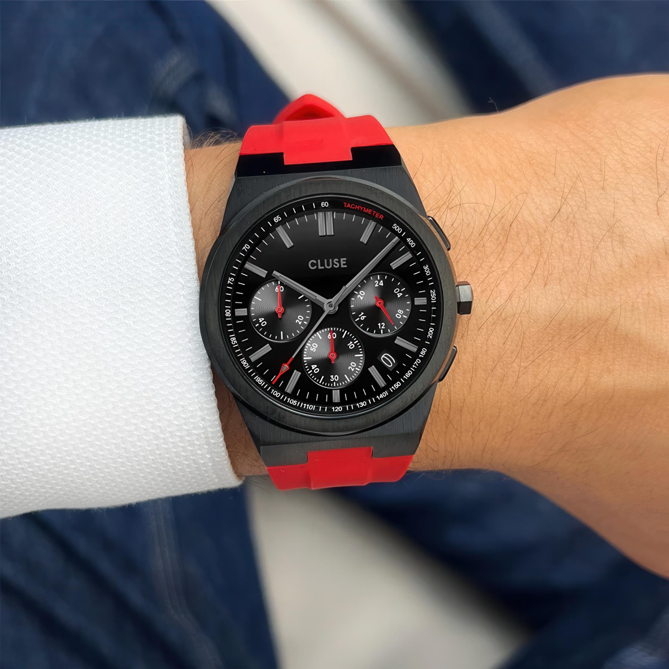 Мужские наручные часы Cluse Vigoureux CW20810. Точный кварцевый механизм с аналоговой индикацией. Полимерный ремешок. Натуральный полимерный материал является идеальным для изготовления ремешка благодаря своей чрезвычайной прочности и гибкости. Функция хронографа. Браслет из нержавеющей стали. Прочное, устойчивое к царапинам минеральное стекло защищает часы от повреждений. На циферблате отображается текущее число месяца. Часы являются водонепроницаемыми до 5 Бар. Цвет циферблата: Черный. Цвет корпуса: Черный. На стрелки и отметки нанесен светонакопительный состав, благодаря этому считывать информацию с циферблата возможно и в темноте. Толщина: 11 мм. Гарантия: 2 года.