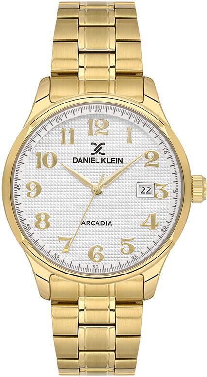Мужские наручные часы Daniel Klein Arcadia 14050-4. Точный кварцевый механизм с аналоговой индикацией. В отличие от механических часов, не требуют завода и работают от батареи, показывая отклонение всего несколько секунд в месяц. Браслет из нержавеющей стали обладает высокой прочностью и износостойкостью, обеспечивая долговечность даже при активной эксплуатации. Материал устойчив к коррозии и сохраняет свой внешний вид надолго. Корпус изготовлен из высококачественной часовой латуни с высокими антикоррозийными свойствами. Прочное, устойчивое к царапинам минеральное стекло защищает часы от повреждений. Часы являются водонепроницаемыми до 5 Бар. Цвет корпуса: Желтое золото. Цвет циферблата: Белый. Высота (с ушками): 41 мм. Толщина: 11 мм. Гарантия: 1 год.