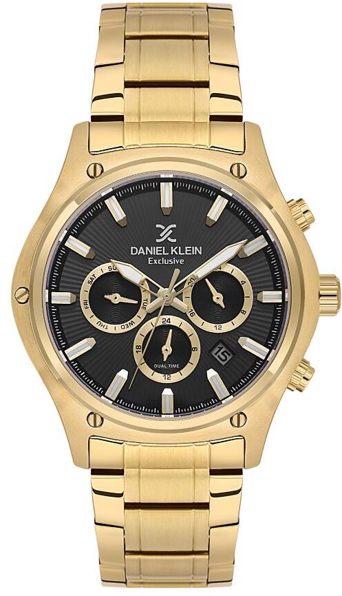 Мужские наручные часы Daniel Klein Exclusive 14057-4. Точный кварцевый механизм с аналоговой индикацией. В отличие от механических часов, не требуют завода и работают от батареи, показывая отклонение всего несколько секунд в месяц. На стрелки и отметки нанесен светонакопительный состав, благодаря этому считывать информацию с циферблата возможно и в темноте. Браслет из нержавеющей стали обладает высокой прочностью и износостойкостью, обеспечивая долговечность даже при активной эксплуатации. Материал устойчив к коррозии и сохраняет свой внешний вид надолго. Отображение времени возможно в 12-часовом или 24-часовом формате. Корпус изготовлен из высококачественной часовой латуни с высокими антикоррозийными свойствами. Прочное, устойчивое к царапинам минеральное стекло защищает часы от повреждений. Часы являются водонепроницаемыми до 5 Бар. Цвет корпуса: Желтое золото. Цвет циферблата: Черный. Высота (с ушками): 50 мм. Толщина: 12 мм. Гарантия: 1 год.