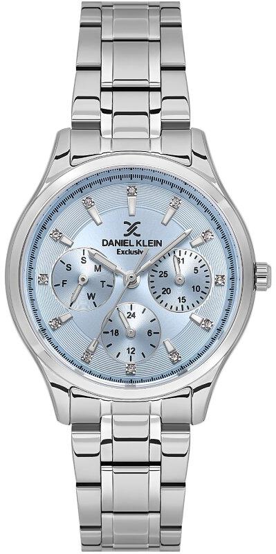 Женские наручные часы Daniel Klein Exclusive 14089-3. Точный кварцевый механизм с аналоговой индикацией. В отличие от механических часов, не требуют завода и работают от батареи, показывая отклонение всего несколько секунд в месяц. На стрелки и отметки нанесен светонакопительный состав, благодаря этому считывать информацию с циферблата возможно и в темноте. Браслет из нержавеющей стали обладает высокой прочностью и износостойкостью, обеспечивая долговечность даже при активной эксплуатации. Материал устойчив к коррозии и сохраняет свой внешний вид надолго. Отображение времени возможно в 12-часовом или 24-часовом формате. Корпус изготовлен из высококачественной часовой латуни с высокими антикоррозийными свойствами. Прочное, устойчивое к царапинам минеральное стекло защищает часы от повреждений. Часы являются водонепроницаемыми до 3 Бар. Цвет корпуса: Серебристый. Цвет циферблата: Голубой. Высота (с ушками): 34 мм. Толщина: 8 мм. Гарантия: 1 год.