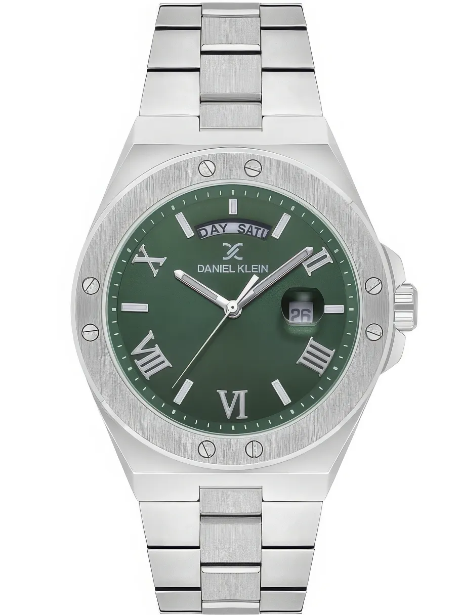 Мужские наручные часы Daniel Klein Premium 13736-3. Точный кварцевый механизм с аналоговой индикацией. Браслет из нержавеющей стали. Латунный браслет. Прочное, устойчивое к царапинам минеральное стекло защищает часы от повреждений. На циферблате отображается текущее число месяца и день недели. Часы являются водонепроницаемыми до 5 Бар. Цвет циферблата: Серебристый. Цвет корпуса: Зеленый. На стрелки и отметки нанесен светонакопительный состав, благодаря этому считывать информацию с циферблата возможно и в темноте. Толщина: 10 мм. Гарантия: 1 год.