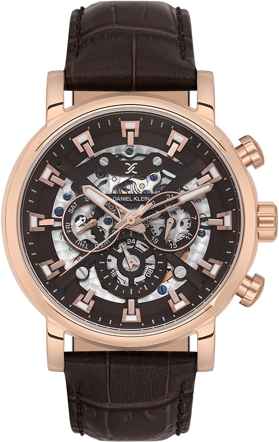 Мужские наручные часы Daniel Klein Skeleton 13850-5. Механические с автоподзаводом. Пружина механизма заводится автоматически благодаря естественным движениям владельца в процессе ежедневной носки часов. На стрелки и отметки нанесен светонакопительный состав, благодаря этому считывать информацию с циферблата возможно и в темноте. Ремешок изготовлен из кожи. Гибкость такого ремешка позволяет точно регулировать посадку часов на руке. Отображение времени возможно в 12-часовом или 24-часовом формате. Корпус изготовлен из высококачественной часовой латуни с высокими антикоррозийными свойствами. Прочное, устойчивое к царапинам минеральное стекло защищает часы от повреждений. Часы являются водонепроницаемыми до 5 Бар. Цвет корпуса: Розовое золото. Цвет циферблата: Коричневый. Высота (с ушками): 44 мм. Толщина: 14 мм. Гарантия: 1 год.